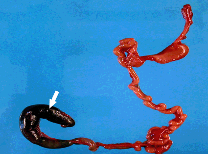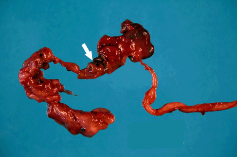 Due to the findings the couple underwent genetic counseling including CF. The mother was found to be positive for the mutation: ΔF-508. Genetic amniocentesis and tests to rule out STORCH were performed. Another ultrasonographic evaluation was done the third day of after admission which revealed the same findings, with no ascites or calcifications and a normal amount of amniotic fluid. Maternal test for Toxoplasmosis was negative (ELISA), IgM for CMV was negative and IgG positive. IgG for Herpes simplex 1 was positive. Amniotic fluid tests for CMV (Shell-Vial and PCR) returned negative. During her hospital stay vaginal bleeding continued with no alteration in subsequent coagulation tests. At the 24th week (11th day after admission) premature rupture of membranes ensued and 4 hours later she was transferred to the delivery room with regular contractions, the cervix fully effaced and 8 cm of dilation. Fifty minutes later she delivered a male fetus weighing 572 grams with an Apgar score of 6 at the first minute and 7 at the fifth minute. Resuscitation was needed immediately after delivery; the newborn was intubated and transferred to the neonatal intensive care unit (NICU). The newborns physical examination revealed abdominal distention and severe signs of prematurity consistent with 23-24 gestational weeks. In the NICU the newborn received therapy with surfactant 100% oxygen with partial response. The abdominal distension worsened and abdominal X-ray showed intestines without air, after adding contrast the abdominal cavity and the proximal small bowel were identified with suspicion of obstruction at the level of the terminal ileus. An abdominal ultrasound showed severely distended bowel with a liquid content and without calcifications. The newborn died 18 hours after delivery. The maternal post-partum period was normal and the patient was discharged after 48 hrs. A postmortem examination of the fetus revealed no evidence of external malformations and atresia of the terminal ileum with total obstruction of the intestinal lumen; near the atretic portion changes consistent with meconium ileus were seen. Foci of mucous deposition on the intestinal surface and calcifications were observed, all features highly suggestive of CF (Figures 2, 3).