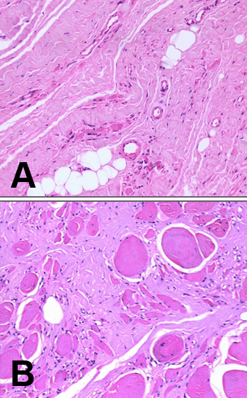 Case Report: This study examined signaling mechanisms that stimulate protein degradation, which may govern selective muscle wasting, in a patient with Miyoshi myopathy. Oxidative stress, nitric oxide signaling and protein degradation through the ubiquitin proteasome pathway were studied in relatively spared hamstring and wasted gastrocnemius muscle of the patient and in control muscle. Oxidative stress occurred in spared and wasted Miyoshi myopathic muscle. A strong anti-oxidant response was observed in spared muscle. Tyrosine nitration of 56kDa protein(s) was 2.3 and 5 fold higher in spared and wasted muscles respectively compared to normal. Nitrocysteinylated proteins were comparable between spared hamstring and normal muscle but reduced 35% in gastrocnemius muscle compared to normal. Ubiquitinylated proteins were increased 2.6 fold in the hamstring muscle and 1.6 fold in the gastrocnemius muscle compared to normal. The protein content of the hamstring and gastrocnemius muscles was reduced 43% and 37% respectively compared to normal. Myosin heavy chain and actin levels were normal in hamstring muscle but reduced nearly four fold in gastrocnemius muscle compared to normal. Conclusion: Oxidative and nitrosative stress and loss of actin and myosin were associated with selective muscle wasting of Miyoshi myopathy. A strong anti-oxidant response that protects myofibrillar proteins against degradation may spare muscle in Miyoshi myopathy. | |
