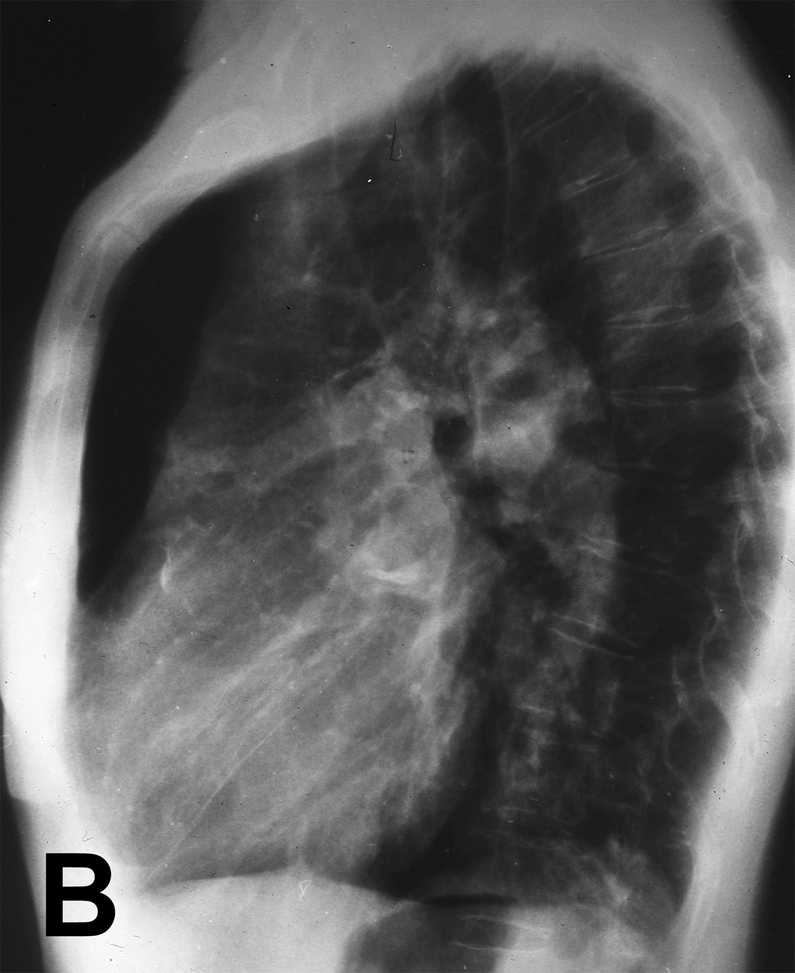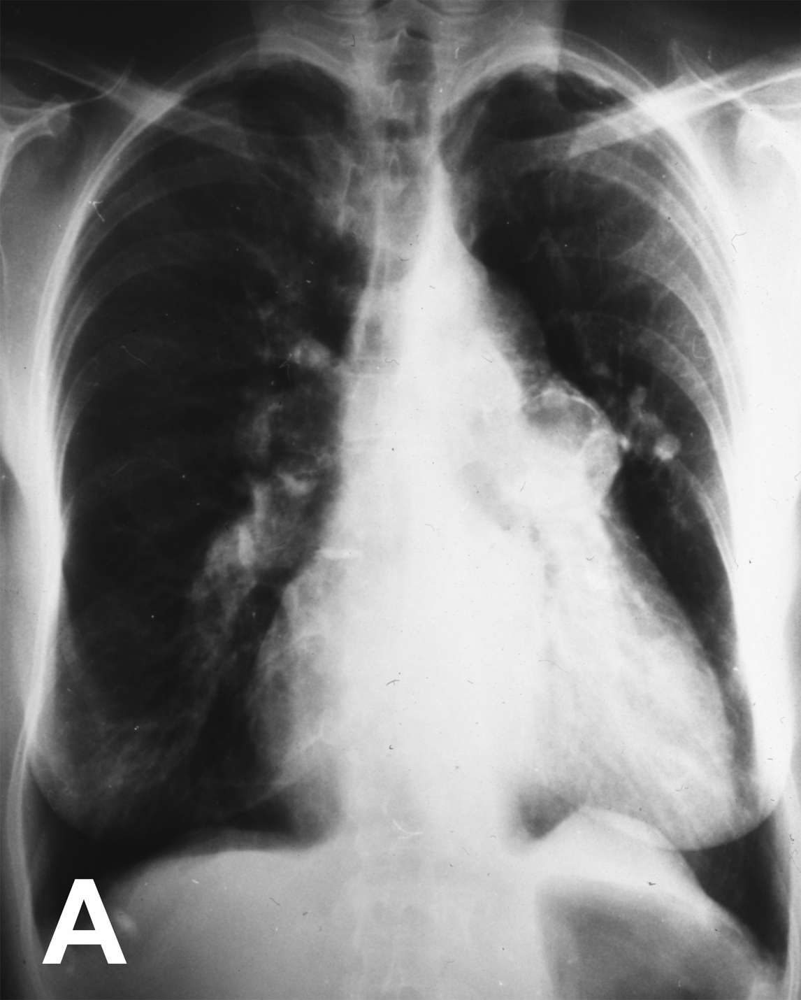Aortopulmonary window is a rare defect caused by failure of fusion of the two opposing conotruncal ridges which are responsible for separating the truncus arteriosus into the aorta and pulmonary tract. A case of long survival with aortopulmonary window causing Eisenmenger syndrome is presented. A 65-year-old female patient was admitted with cardiorespiratory failure. She had had effort dyspnoea for 30 years but had refused investigations. Physical examination revealed generalised cyanosis, marked anasarca and a holosystolic murmur superimposed on an accentuated S2. Oxygen saturation was 95% but the arterial blood gas showed significant hypoxia (pO2 65 mmHg). Blood pressure was 150/80 mmHg. The ECG on admission showed pulmonary P-waves and signs of right ventricular hypertrophy. Echocardiography revealed a grossly dilated right ventricle with severe tricuspid regurgitation and mild pulmonary insufficiency. The estimated pulmonary pressure of 140/70 mmHg was nearly identical with the systemic blood pressure. The dimensions of the left atrium and left ventricle were within normal limits with good left ventricular systolic function. Chest X-ray showed significantly dilated pulmonary vessels and a round calcified mass in the left pulmonary hilum (Figures 1A, 1B). The patient died suddenly on the following day. Autopsy revealed a large (28 mm) communication between the pulmonary trunk and the aorta (Figure 2).