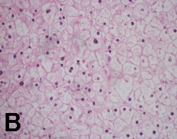 Case 1: A 12-year-old African American female was diagnosed with T1DM at six years of age. She first presented in the pediatric gastroenterology (GI) clinic at 10 years of age for evaluation of abdominal pain. Past medical history was significant for poor glycemic control with multiple admissions for diabetic ketoacidosis (DKA). Physical examination revealed weight and height between the 50th and 75th percentiles. Her hemoglobin A1c (HbA1c) ranged from 10 to 12%. Her first liver ultrasound showed normal size and echotexture. Repeat abdominal ultrasound six months later revealed an enlarged liver measuring 19 cm with a heterogeneous texture. Her liver tests showed aspartate aminotransferase (AST) - 33 U/L, alanine aminotransferase (ALT) - 64 U/L. Two months later, she was admitted for DKA, and her liver enzymes worsened (AST - 983 U/L, ALT - 494 U/L). A repeat liver ultrasound showed an enlarged liver with a hyperechoic echotexture. A liver biopsy was subsequently performed which revealed findings consistent with diffuse glycogen-rich cytoplasm and glycogenated nuclei of hepatocytes; there was no steatosis, fibrosis or inflammation. She was placed in a foster home and attended an intensive diabetic control program. Her HbA1c decreased from 12% to 10%; her hepatomegaly resolved and liver tests improved after four weeks of proper glycemic control. She maintained her HbA1c between 8 - 9% thereafter with no recurrence of hepatomegaly or transaminase elevation. Case 2: A 14-year-old Hispanic male was admitted for evaluation of lower leg edema and massive hepatomegaly. He was diagnosed with T1DM at three years of age. His glycemia had been poorly controlled resulting in several episodes of DKA. Physical exam demonstrated an enlarged liver palpable to the umbilicus. His weight was between 25th and 50th percentiles and his height was below 5th percentile. He was in Tanner 1 for pubic hair and Tanner 3 for testicles. His HbA1c ranged from 9 to 12%. His liver tests showed AST - 878 U/L, ALT - 751 U/L. The liver ultrasound showed markedly enlarged liver measuring 26 cm in span. After evaluation for chronic liver disease was negative, a liver biopsy was performed. The pathology reported glycogen-rich cytoplasm and glycogenated nuclei of hepatocytes with no steatosis, inflammation or fibrosis (Figures 1 and 2). He underwent strict diabetic control, his liver enzymes returned to normal within 4 weeks (AST - 24 U/L, ALT 26 - U/L, HbA1c - 8.2%). Unfortunately, due to multiple social circumstances, he could not maintain good glycemic control. He continues to have hepatomegaly, a high HbA1c of 12% and mild transaminase elevation. |