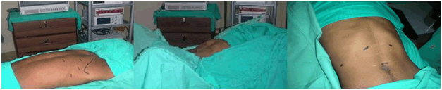Patient 4: A 61-year-old female, a diagnosed case of distal esophageal adenocarcinoma on biopsy came to the clinic for the surgical management. CT scan was done and disease was staged to be T3N0. The patient was scheduled for a Minimally Invasive Esophagectomy. The procedure was completed in 10 hours with clear margins and 12 lymph node resections. There were no operative complications and the patient was discharged from the hospital on the 11th post operative day. The patient is alive, healthy and disease free at a follow up of three months. Patient 5: A 51-year-old male presented to the clinic with complaints of progressive odynophagia and recurrent vomiting on and off for a period of five months. Endoscopicc biopsy revealed distal squamous cell carcinoma. CT scan revealed tumor involving lower esophagus, staged T3N0. MIE was done with an operative time of nine hours. Patient was placed in supine position for the thoracoscopic part of the operation. Modified lithotomy position was used for the laproscopic part (Figure 3). The surgery was done with with clear margins and 18 lymph nodes were resected. The patient had a pleural effusion post-operatively which was managed conservatively. After a hospital stay of 12 days the patient was discharged. The patient remains to be healthy and disease free at a follow up of two months. | ||||||