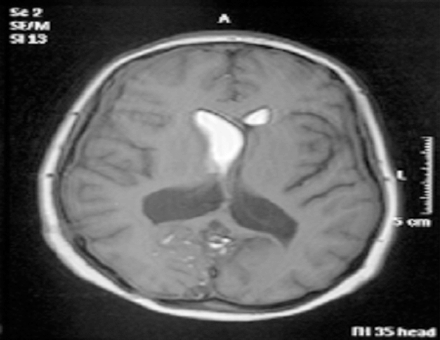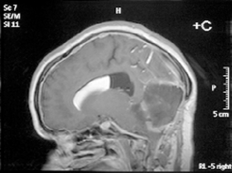 Surgery in the form of a posterior fossa craniectomy and emptying of the cyst with removal of membranes if possible was advised, and this was performed uneventfully in June 2005. The cyst walls were very adherent to the neural structures and could not be removed. The cutaneous mass near the torcula was removed during the approach and both this and the main lesion were confirmed histologically to be dermoid cysts. The patient recovered well and was discharged home on the ninth post-operative day. Ten weeks later she was readmitted to the emergency with recurrent headache, nausea and vomiting and dramatic worsening of her ataxia over the course of a weekend. Her admission Glasgow Coma Scale (GCS) was 13 (E3 V4 M6) and a cranial CT scan revealed an increase in the ventricular size compared to the pre-operative scans. An external ventricular drain was inserted by the emergency team; the cerebrospinal fluid (CSF) was under significant pressure but microscopic examination and culture were negative. The patient’s GCS recovered quickly to 15 with improved neurology, but subsequent attempts to clamp the external ventricular drain led to recurrent symptoms and so it was converted to a ventriculo-peritoneal shunt uneventfully. The patient was well for two days, but within a day of beginning to mobilize, she began to complain of recurrent headaches and then dropped her GCS again. A cranial CT scan showed a well-placed ventricular catheter but persistent ventriculomegaly. She was taken for shunt revision, where a blocked ventricular catheter was replaced. She recovered to GCS 15 quickly and remained well for two days, but once again within a day of being mobilised she complained of headaches and dropped her GCS. On this occasion she aspirated and developed significant hypoxia requiring intubation for airway control and toilet. A cranial CT scan again showed ventriculomegaly and the shunt was revised for a second time, again finding a blocked proximal end although this time we elected to replace the entire shunt. The patient was managed in the Intensive Care Unit for her chest problems for five days before being successfully extubated and returned to the ward. At this stage she was GCS 15, headache free but with persistent mild cerebellar signs. We attempted to mobilise her once more, but for the third time this led to recurrent headaches and a drop in her GCS. Once again a cranial CT scan showed ventriculomegaly and shunt revision was clearly required. On this occasion, a two-stage procedure was performed. First, the neuroendoscope was inserted via a right frontal burrhole and approximately 13 mls of yellowish, highly viscid, lipoid material was aspirated from the frontal horn. Interestingly, this proved difficult to do as the material appeared to react with the plastic of the syringes and impede smooth movement of the plunger, such that four or five syringes were needed. When all the fat had been removed, an Ommaya reservoir was placed and the ventriculo-peritoneal shunt was then revised completely once again. Unfortunately, the ventricular catheter and shunt valve, which were to have been kept for microscopic examination, were mislaid in theatre. As usual, the patient recovered rapidly to GCS 15, headache free, but this time when she was mobilized after a couple of days in bed there was no deterioration and she managed to progress to the regional rehabilitation hospital and eventually to independent life in the community. She has currently been followed up for six years with no further shunt malfunctions and imaging showing normal ventricular size, complete evacuation of the lipid from the right lateral ventricle and no recurrence of the posterior fossa dermoid cyst (Figures 2,3). | ||||||