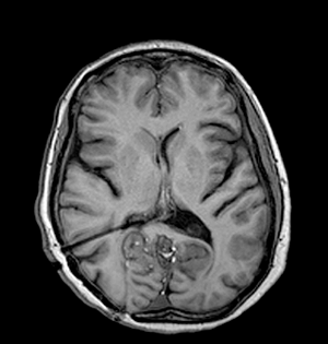 A 19-year-old, right-handed female presented via the neurosurgical outpatient department with a history of clumsiness, incoordination and gait disturbance since the age of seven, with recent functional deterioration and the development of occipital headaches. These headaches were constant, exacerbated by coughing and straining, associated with nausea and not relieved by analgesia. Examination revealed an ataxic gait, positive Romberg’s test, lateral gaze nystagmus more pronounced to the right side and oscillopsia in upward gaze. Hyper-reflexia was noted in all four limbs with positive Hoffman’s sign bilaterally. The patient had been known, since birth, to have a subcutaneous fleshy mass measuring 1x2 cm just inferior to the torcula; this was thought to be a benign cyst and had not changed significantly in size since early childhood. An MRI scan of the head and cervical spine revealed a large midline cerebellar tumor (5 x 5.7 x 6.9 cm) with heterogenous signal characteristics; there was chemical shift artifact indicating the presence of fat as well as evidence of previous rupture and diffuse subarachnoid / intraventricular dissemination of the fat (Figure 1). The tumor was exerting mass effect on the brainstem and causing mild obstructive triventriculomegaly. | ||||||