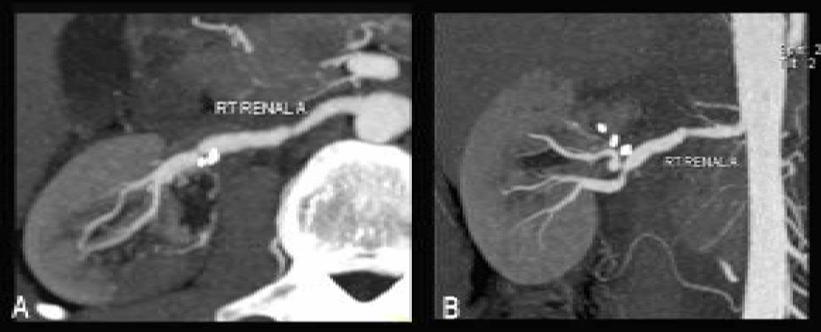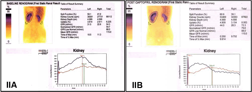 His antihypertensive medications included Telmisartan 40 mg/day, long acting Indapamide 1.5 mg/day, Clonidine 100 µg/day, Amlodipine 10 mg/day and Furosemide 20 mg/day. On these medications his blood pressure was 160/100 mmHg and hence considered to have resistant hypertension. Renal artery duplex scan and contrast CT scan abdomen showed multiple aneurysms in distal right renal artery and stenoses proximal and distal to them (figure 1A, B). Tc DTPA Captopril renogram was done to assess renal function, which showed smaller right kidney with prolonged T max, which accounted for 39.1% of total renal function (figure 2A, B). | ||||||