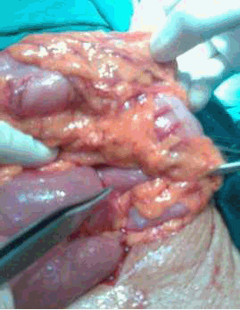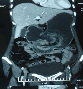 A 50-year-old female patient presented to ESI-PGIMSR with complaints of acute abdominal pain, vomiting and mass in the upper abdomen since four days. She had undergone gastrojejunostomy and truncal vagotomy for chronic duodenal ulcer twenty years back. On physical examination, the patient was dehydrated with pulse rate of 108/minute, blood pressure of 100/60 mmHg and respiratory rate of 18/min. Abdominal examination revealed upper midline abdominal scar of previous laparotomy. A tender sausage shaped lump was palpable in the umbilical region measuring 10x5 cm which moved with respiration (figure 1). Laboratory investigations showed hemoglobin of 9.3 gm%. After correction of dehydration and electrolyte imbalance, an emergency upper gastrointestinal endoscopy was carried out which revealed an intussusception of small bowel at gastro-jejunal anastomosis (figure 2). Computed tomography (CT) scan of the abdomen and pelvis revealed retrograde jejuno-gastric intussusception through previous gastrojejunostomy with edematous walls of intussusception and minimal ascites (figure 3). After initial treatment with intravenous fluids, nasogastric suction and antibiotics, emergency exploratory laparotomy was carried out. Operative findings: Peroperatively a soft mass was palpable in the stomach with evidence of a posterior gastro-jejunostomy afferent and efferent loops intussusception into the gastric stump. Manual reduction of the same showed viable bowel. Jejuno-jejunostomy was performed and afferent and the efferent loops fixed to the gastric wall. The postoperative recovery was uneventful and patient was discharged on the ninth postoperative day (figure 4-6). | ||||||