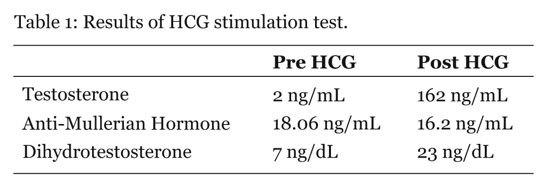 Our patient was a six-month-old Hispanic infant referred to our clinic for ambiguous genitalia. The patient was born at an outside institution via cesarean-section for fetal bradycardia. He was born full term with birth weight of 3.2 Kg. Prenatal ultrasomography (USG) were indeterminate regarding fetal sex assignment. Amniocentesis was refused. In the neonatal intensive care unit, the patient was found to have a microphallus and an undescended testicle on the left side. An endocrine workup was done prior to discharge. Congenital adrenal hyperplasia was ruled out. A testosterone level on day-2 of life was 132 ng/dL and a karotype revealed 46XY/47XYY. The decision had been made to raise this patient as a male. Family history was non-contributory including no maternal exposure to androgens or signs of virulization. The patient presented to us at six month of age for transfer of care. His physical exam was significant for a phallic structure with a length of three cm, a perineal hypospadias with chordee and incomplete fusion of labiosrotcal folds. He had an underdeveloped left scrotum, no palpable left testicle, and a palpable right testicle in the inguinal canal, a right rugated scrotum, and an anal opening to base of scrotum measuring two cm. At six months of age, we did a work up to rule out partial androgen insensitivity syndrome and 5a-reductase deficiency. Human chronic gonadotropin stimulation test showed an increase in testosterone levels pre HCG vs. post HCG (table 1). The anti-Mullerian hormone was essentially unchanged and the testosterone/DHT ratio was normal for age at <10:1. An ACTH stimulation test was also done to rule out a congenital adrenal hyperplasia variant which was negative. The pelvic USG and MRI both revealed a right testicle in the inguinal region, no left testicle, and a blind ending vagina and uterus. The voiding cystourethrogram (VCUG) showed normal kidneys and a urogenital sinus. Cytogenetics confirmed 45X (41% interphase nuclei), 47XYY (45%) and 46XY (14%) of the 30 cells screened confirming our diagnosis of mixed gonadal dysgenesis. It is unclear why the first cytogenetics test did not confirm other cell lines on karyotype analysis. He is currently scheduled for surgery that will include an exploratory laparotomy to search for the gonad, which was not visualized via MRI on the left side. | ||||||