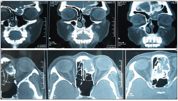 Case Report: We report case of a 55-year-old hypertensive patient who presented with intermittent nasal bleeding. Computed tomography (CT) scan suggests left anterior ethmoidal mass with anterior cranial fossa extension. Biopsy was suggestive of synovial sarcoma. She had history of polyp extraction two times but biopsy was suggestive of inflammatory origin. This patient received EBRT 50Gy in 25 fractions. No recurrence was noticed in one year follow up. Conclusion: We report unusual ethmoid sinus synovial sarcoma masquerading as chronic sinusitis in an elderly female patient, unlikely age presentation. | |