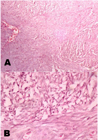 One 55-year-old, hypertensive female patient was admitted in the emergency department with history of intermittent nasal bleeding and headache of one week duration. She was being treated for chronic sinusitis for last eight months. She had undergone left rhinotomy with removal of frontonasal polyp and then removal of ethmoidal polyp after three months interval. The biopsies were diagnostic of inflammatory non-malignant lesions. With onset of new symptoms of nasal bleeding, endoscopy examination was repeated to show recurrence of polyp. Computed tomography scan of the face showed a mass in left anterior ethmoid sinus with extension into the floor of anterior cranial fossa. Medially the lesion eroded the lamina papyracea with no obvious intraorbital extension. Localised bone erosion was noted (Figure 1). Left ethmoid sinus was explored and mass was excised. The biopsy report was suggestive of epithelial cell aggregates with densely cellular fascicles of spindle cells surrounding the epithelial cells, suggestive of biphasic synovial cell sarcoma (Figure 2A, B). Diagnosis was confirmed with immunohistochemical positivity for EMA (focal), Mic-2, bcl-2, calponin, S-100 and CD-56 (focal) but negative for CD-34 and cytokeratin. CT Scan of thorax and ultrasonography of abdomen were negative for metastatic disease. Postoperatively she received only radiation, 50 Gray (Gy) in five weeks, in 25 fractions (200 centiGy dose per fraction). One year into follow up there is no evidence of recurrence of disease. | ||||||