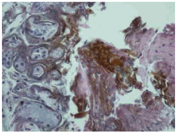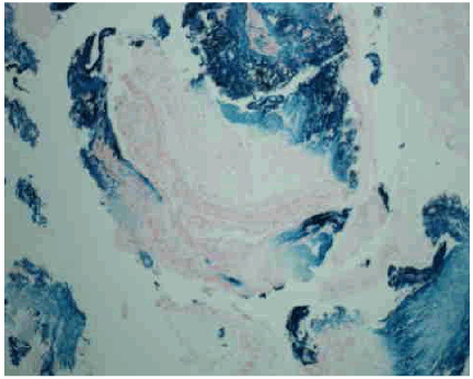 A 64-year-old woman presented with acute onset of cough with hemoptysis 20 minutes after ingestion of her daily iron tablets that she has been taking for the last three weeks. She also experienced wheezing and shortness of breath that lasted for 4-5 hours along with cough and dark brownish sputum which brought her to the hospital. Three weeks prior to this, she was diagnosed to have severe iron deficiency anemia and required blood transfusions. She was placed on oral iron therapy by her physician with ferrous sulfate 325 mg tds, PO. She experienced generalized weakness and dyspnea on exertion as a result of the anemia prior to the transfusions. Otherwise, she has been well. She was an ex-smoker (60 pack/year) who quit 20 years ago. She had traveled frequently to Mexico and the Caribbean in the last year. Examination was remarkable only for auscultatory wheeze over the right mid zone anteriorly and right base posteriorly. Hematologic investigations showed microcytic anemia with hemoglobin of 11.1 g/dL and mean corpuscular volume, (MCV) of 73 fL. Chest radiograph revealed a large left hiatal hernia but was otherwise unremarkable. A contrast chest computed tomography (CT) scan confirmed the hiatal hernia but was devoid of any other abnormality. Fiberoptic bronchoscopy done within 24 hours revealed that the tracheal and bronchial mucosa was erythematous and edematous. The mucosa at the bifurcation of the right middle and lower lobe and in the right lower lobe was most affected and appeared corrugated, ulcerated, friable and bled easily (Figure 1). The area was lavaged and thick brownish secretions were suctioned. Bronchial biopsy at the level of right middle and lower lobe carina and from the right lower lobe revealed features of mucosal burn with edema and inflammation and stained positive for iron with prussian blue stain (Figure 2, 3). The patient was assessed for adequacy of the swallowing mechanism which was found to be adequate. Following discharge she was scheduled to be seen over the next six months to reassess for evidence of local airway sequela however patient was lost to follow up. | ||||||