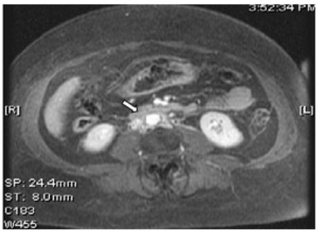 A 66-year-old African American female presented to the emergency department with a two months history of progressively decreasing urine output. She noticed no urine output for last one day. She had no history of chronic kidney disease, kidney stones or other significant medical illnesses in the past. She denied any abdominal pain, fever, chills or urinary tract symptoms. Her examination revealed blood pressure of 187/110 mmHg with 2+ pitting edema at ankles. A foley catheter was inserted in the emergency room but no urine output was recorded. Laboratory data showed serum creatinine of 9.2 mg/dl. Her serum creatinine was normal at 0.8 mg/dl, three months ago. A renal ultrasound showed normal sized kidneys with mild bilateral pelvicaliectasis. A non-contrast computed tomography (CT) scan of abdomen was unremarkable for stones but revealed mild hydronephrosis with indistinct periaortic fullness (Figure 1, arrow). Retrograde pyelogram revealed bilateral ureteral strictures. After placement of uretral stents, patient had brisk urine output and serum creatinine trended down back to the normal range. MRI with gadolinium done on day-3 of admission, showed an enhancing soft tissue infiltration encasing the abdominal aorta and IVC (Figure 2). No significant pelvic or retroperitoneal lymphadenopathy was identified. Fine needle aspiration biopsy of the retroperitoneal infiltration revealed metastatic adenocarcinoma in the background of dense fibrosis. The suspicion was raised for lungs, breast or uterus as the source of primary tumor. Patient's history was negative for any pulmonary, uterine or breast related symptoms. However, her breast examination that was deferred earlier on admission was suspicious for a left breast nodule. The mammogram revealed a 2x3 cm soft tissue density and an ultrasound guided fine needle aspiration biopsy confirmed the breast adenocarcinoma. The positive immunohistochemical staining of the malignant retroperitoneal tissue cells for estrogen, progesterone and herceptin-2 receptors, confirmed breast as the primary site. Patient was referred to oncology and she was initiated on palliative chemotherapy with weekly paclitaxel, carboplatin and herceptin. After six weeks of chemotherapy, patient was admitted with pneumonia, severe sepsis and respiratory failure. As per family and patient's prior wishes, she was made comfort care only and she expired two days after her hospitalization. | ||||||