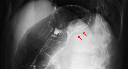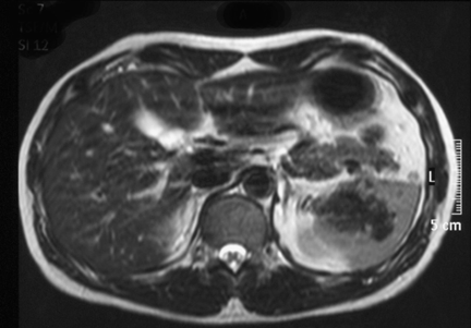 A 38-year-old man without any symptoms was found to have a splenic mass on routine medical examination. Physical examination found nothing remarkable. Laboratory test results were within normal limits. Tumor marker levels were not elevated (CEA: 1 ng/ml, AFP: 2 ng/ml, CA19-9: 2 ng/ml). Upper gastrointestinal (GI) series revealed extrinsic compression of the upper body of the stomach (Figure 1). An abdominal computed tomography (CT) scan revealed a 5-cm tumor and progressive delayed enhancement in the hilus of the spleen (Figure 2). Abdominal magnetic resonance imaging (MRI) revealed that the tumor was isointense on a T1-weighted image and hypointense on a T2-weighted image (Figure 3). The findings were confirmed by abdominal ultrasonography and we subsequently followed the patient by clinical and radiological examination. CT scan showed that the tumor was not enlarged four months after the initial presentation. It was thought that there was little possibility of malignancy, but on patient's request laparoscopic splenectomy was performed for diagnosis. Surgery was performed under general anesthesia in the right semilateral decubitus position. Four ports were used: the first 10-mm trocar was on the median line, two cm above the umbilicus. Two additional 10-mm trocars and a 5-mm trocar were on the left subcostal line between the median to the axillary line. An endoscopic linear cutter device (Endo GIA, Ethicon Endosurgery, Cincinnati, OH, USA) was used to dissect the splenic artery and vein. The excised spleen was placed into a specimen retrieval bag and extracted after enlarging the site of the telescopic trocar. A tube drain was placed in the residual cavity. The total operative time was 100 min and blood loss was 10 ml. The removed spleen was 11×7×5.5 cm in size and 150 g in weight. Macroscopic examination showed 0.3–0.5 cm red-brown multinodular lesions interspersed with a 5-cm white lobular tumor at the periphery (Figure 4). Histopathologically, the main component of the white portion consisted of hyperplastic collagen fibers. The red-brown lesions were multiple angiomatoid nodules in a fibrotic stroma. Each angiomatoid nodule was made up of slit-like, round irregular-shaped vascular spaces lined by endothelial cells and interspersed ovoid cells (Figure 5). Immunohistochemical studies revealed three different types of blood vessels within the angiomatoid nodules: i) cord capillaries (CD34+/CD8-/CD31+), ii) sinusoid vessels (CD34-/CD8+/CD31+), and iii) small veins (CD34-/CD8-/CD31+). Thus, a diagnosis of SANT was made. | ||||||
