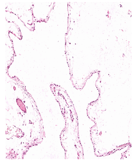 A 41-year-old lady presented with complaints of gradual, progressive deterioration of lumbar axial pain since six months, with aggravation since seven days. The pain was radiating to both lower limbs along the posterior aspect of thigh and calf. There was no obvious history of trauma. Examination revealed positive straight leg raising test in both lower limbs with no motor or sensory deficit. An MRI was done, that showed diffuse disc bulge at L5-S1 level with an inferiorly migrated central extrusion causing severe compression of the thecal sac (Figure 1, 2). It also revealed an intradural, extramedullary, cystic space occupying lesion with an internal solid-cystic nodule, extending from L1 to L2-3 causing compression and anterior displacement of filum and cauda equina (Figure 1). The lesion showed signal intensities similar to those of CSF on T1, T2 and FLAIR images. There was no enhancement noted after administration of contrast in the MR scans. The imaging features were suggestive of a benign cyst with possibilities of a cysticercosis or an arachnoid cyst. The patient was advised surgery for the removal of cyst with L5-S1 microdiscectomy, but the patient refused surgery and continued her activities, managing well with oral analgesics intermittently for a period of 12 to 14 months. However, later she presented with acute aggravation of lumbar axial pain and spasms with poor response to analgesics. The pain was continuous, radiating to both lower limbs, not relieved by rest, along with perineal pain and hypoesthesia. Motor power was normal in both lower limbs with urinary urgency and frequency without difficulty in initiation and incontinence. Repeat MRI showed no interval change in the degree of disc extrusion, however the cyst that was initially on the posterior aspect of the filum and cauda equina, had shifted anteriorly with posterior displacement of cauda (Figure 3). The patient was posted for surgery for L5-S1 discectomy with excision of cyst. At surgery a L1-L3 laminectomy was done. Careful durotomy of the bulging dura revealed a thin walled, oval shaped cyst of size 4.5x2x1 cm (Figure 4). Externally the surface was smooth. The cyst was removed enbloc. On opening, it was unilocular, fluctuant, transilluminant cyst containing clear fluid with a papery thin, transparent wall. Also, L5-S1 microscopic discectomy was done. Histological study of the operative specimen revealed a thin walled cyst lined by single layer of benign ciliated columnar cells. The wall showed loose connective tissue with no neural tissue (Figure 5). Analysis of the cyst fluid was similar with CSF. Patient was relieved of her symptoms in the immediate post operative period and was made ambulatory on the second post operative day. Two years post surgery, the patient is comfortable and completely relieved of her pain. | ||||||