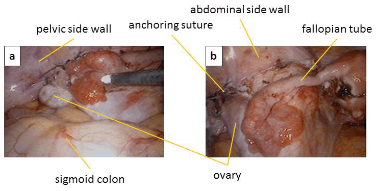 A 32-year-old nulliparous female was referred to our hospital with a diagnosis of invasive cervical cancer. Upon vaginal inspection, the uterine cervix was fragile and carcinomatous. The anterior vaginal fornix was involved and apparent parametrial invasion was observed. The mass measured six cm in diameter on MRI. Pathology revealed invasive papillary squamous cell carcinoma. We proposed radical hysterectomy or concurrent chemoradiation (CCRT) as treatment options, and the patient chose CCRT. She strongly valued the preservation of ovarian function and of fertility. Therefore, we recommended laparoscopic ovarian transposition by the modified procedure as described below. Ovarian transposition was performed according to the method described by Tulandi et al. [6] We used three trocar ports and a camera port in the umbilicus. There was no apparent adhesion in the abdominal cavity. No apparent malignant finding such as dissemination was noted. Peritoneal lavage cytology was negative. The operation was initiated by dividing the left ovarian ligament using a Ligasure (Covidien, Tokyo, Japan). Then, the mesovarium was electrocoagulated and incised to separate the left ovary from the fallopian tube while maintaining the proximity between the fimbria and the ovary (Figure 1). The peritoneum was continuously incised along the line of the ovarian vessels to move the ovary. After adequate mobilization, the left ovary was lifted up to the level of the anterior-superior iliac spine. The ovary was then anchored to the peritoneum on the psoas muscle with two sutures of 3-0 proline (nylon). The same procedures were performed on the right side (Figure 2). The ovaries were marked with metal clips. Blood loss was minimal. The patient underwent CCRT starting one week after surgery. She received a total of 50.4 Gy of whole-pelvic radiation and 10 Gy of brachytherapy, along with six courses of concurrent 40 mg/m2 cisplatin administration. She has just finished the treatment. Notably, the patient also menstruated during the treatment. | ||||||