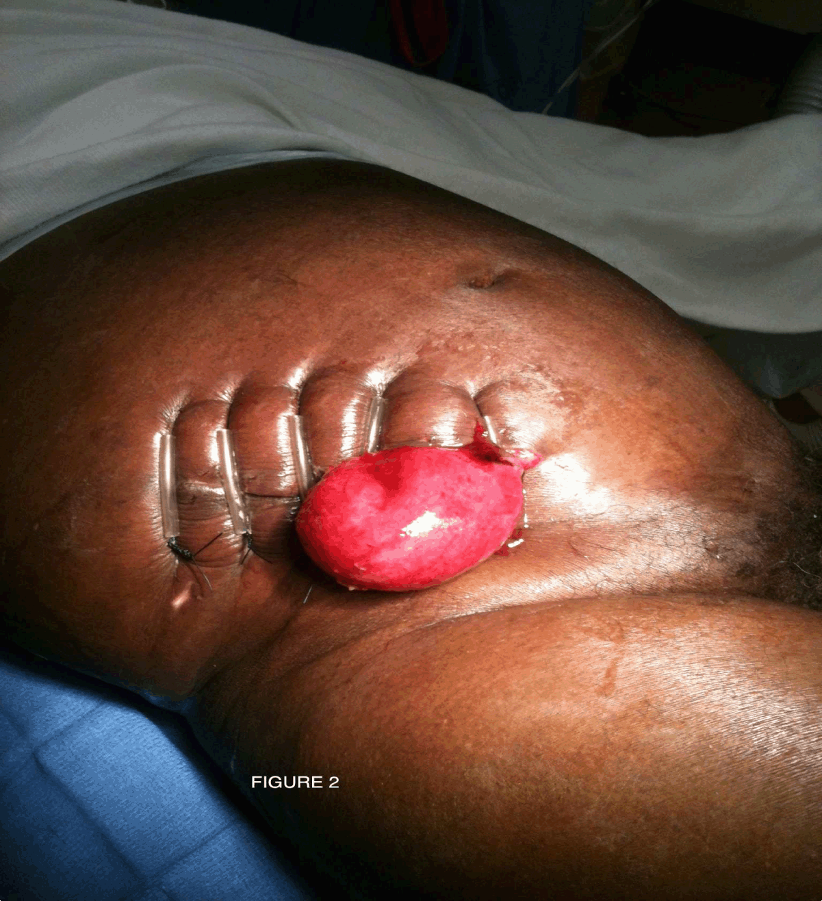 A 71-year-old, male presented to emergency room with 24 hr history of right lower quadrant (RLQ) pain, anorexia and low-grade fever. His past medical history included hypertension, asthma, COPD and cerebral palsy. Patient was disabled with severe flexion deformity at the hip joint. On physical examination he was tachycardic, hypotensive and had RLQ tenderness without peritonitis. Blood tests showed white cell count of 7.6x103 cells/mm3 and hemoglobin of 10.4 g/dl. Computed tomography (CT) scan (Figure 1) showed dilated fluid filled appendix (1.1 cm), with fat stranding confirming acute appendicitis (Figure 1). He was resuscitated, given antibiotics and an emergent open appendectomy performed. Post operatively patient was on the surgical floor but was transferred to the ICU for acute exacerbation of COPD and was started on short course steroids in addition to nebulizers. He recovered over the next few days and transferred to the surgical floor. While awaiting placement to a skilled nursing facility on post op day seven he eviscerated bowel through the Mcburney's incision while having a bowel movement (Figure 2). He was taken to the operating room emergently, bowel was reduced and incision primarily repaired with retention sutures. Patient remained in the hospital and he eviscerated again on the post op day eleven (Figure 3). This time after the bowel was reduced the defect was repaired with a biological mesh and wound approximated with closely placed retention sutures (Figure 4). The patient remained intubated for a week after which tracheostomy was performed due to inability to wean off ventilator. The patient was in the ICU for four days then transferred to a long-term acute care center where he improved over the next four weeks. On follow up his incision healed well. | ||||||