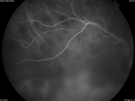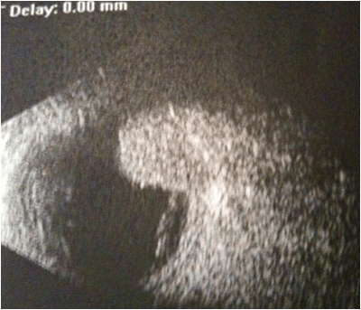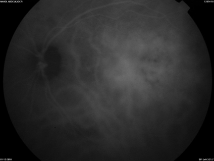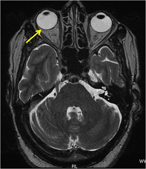 A 63-year-old man presented with blurred vision and a progressive loss of visual acuity for approximately two weeks. Medical history was remarkable for infiltrating breast carcinoma with negative complete work-up, for which he has had mastectomy, radiation therapy and chemotherapy in 2009. Ophthalmic examination showed exophthalmos of the right eye without ptosis. Ocular motility was normal. Best corrected visual acuity was (BCVA) 3/10 on the right eye and 7/10 on the left eye. Anterior segment examination was normal on both eyes with no dense cataracts observed. Fundoscopy under pupil dilatation in the right eye revealed an ill-defined choroidal mass in the upper temporal arcade, impinging on the macula and surrounding the papilla. The mass was associated with pigment epithelium impairment and normal optic discs, without macular edema. Fundoscopy in the left eye did not reveal any tumor. Standardized B-scan ultrasonography of the right eye revealed a posterior, hyperechogenic tumor of the choroid with secondary retinal detachment associated with choroidal thickening (Figure 1). Indocyanine green chorioangiography (ICG) was unremarkable in the left eye, but revealed a tumor in the right eye (Figures 2, 3). Magnetic resonance imaging (MRI) revealed a right ocular expansive lesion with non-circumferential posterior choroidal thickening (Figure 4). According to these findings, a diagnosis of choroidal metastasis from breast cancer was established. A complete workup did not show any evidence of distant metastasis. The patient refused to be treated with radiotherapy due the risk of complications of such treatment and he received systemic chemotherapy every three weeks for six cycles, (epirubicin 100 mg/m2, cyclophosphamide 500 mg/m2, 5-fluorouracil 500 mg/m2). Five months into treatment, the patient reported a decrease in symptoms, his BCVA improved to 6/10 and the choroidal lesion showed complete regression on both MRI and fundoscopy (Figures 5, 6, 7). | ||||||