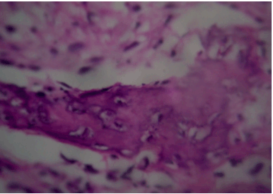 A 25-year-old Indian female patient reported to the Department of Periodontics with complaint of a painless gingival growth in relation to her lower right front teeth. The swelling started as a small nodule that progressed gradually to the present size within a span of one month. The patient did not give any history of trauma, injury or food impaction and there was no significant medical history. An intraoral examination revealed generalized pink gingiva with a well-demarcated, non-tender, firm, focal, sessile nodular growth arising from the interdental papilla of the mandibular right central and lateral incisors lingually. Owing to the pressure from the tongue, the lesion has progressively become flat in appearance. The oval-shaped mass was 2.5x3 cm in size, with a reddish pink color, smooth surface, and distinct edges (Figure 1). Bleeding on probing was noted. Clinically, differential diagnoses for the growth were pyogenic granuloma, peripheral odontogenic fibroma, fibroma and peripheral giant cell granuloma. Because of patient's sex, age, location, colour and consistency of the lesion, a provisional diagnosis of pyogenic granuloma was made for the gingival growth. Oral hygiene instructions were given to the patient and oral prophylaxis was done. After two weeks, the growth was excised conservatively to prevent the development of an unsightly gingival defect in the anterior maxilla, followed by root planing and curettage (Figure 2). The excised tissue was sent for histopathologic examination. The excised tissue was oval, 2.5x3 cm in size, reddish pink and firm in consistency on inspection. While grossing the tissue, slight grittiness was felt. The patient was called after one week for removal of dressing and showed uneventful healing. After six months, recurrence of the growth was not observed (Figure 3). Histologically, the specimen showed parakeratinized stratified squamous epithelium and underlying connective tissue, which was composed of densely packed collagen fibers and fibroblasts. Deeper areas showed the presence of multiple irregular calcified areas and osteoblastic rimming. Patchy distribution of chronic inflammatory cells was seen (Figure 4). Histologically, the specimen was suggestive of peripheral ossifying fibroma/peripheral calcifying fibroma. Based on clinical and histological findings, the lesion was diagnosed as POF. | ||||||