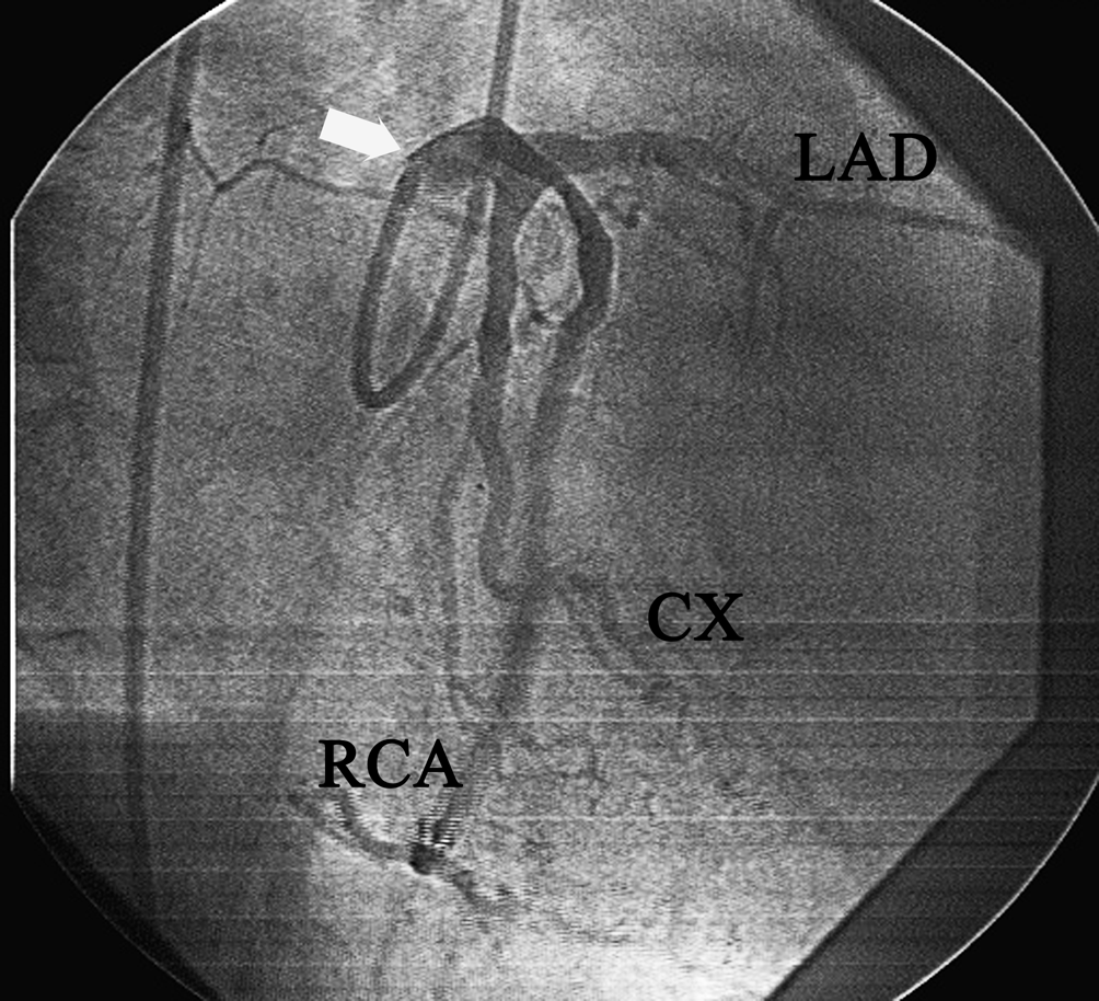 A 53-year-old male applied to the hospital with typical chest pain. He had anterior myocardial infarction (MI) 20 days ago and was referred to our hospital for coronary angiography due to post-MI angina. Risk factors for coronary artery disease included hypercholesterolemia and cigarette smoking. Blood pressure was 100/70 mmHg and heart rate was 90 beats/min. Physical examination was within normal limits except for a third heart sound. Electrocardiography showed sinus rhythm, previous anterior MI and 2–3 mm concave ST segment elevation on precordial leads. Transthoracic echocardiogram revealed decreased left ventricular systolic performance with a left ventricular ejection fraction of 30% and akinesia of anterolateral wall and apex. Coronary angiography demonstrated single coronary artery which was a short left main artery and it divided into three branches: left anterior descending (LAD), left circumflex (LCx) and right coronary arteries (RCA). The SCA was originating from the left coronary sinus (CS) via single ostium, classifiable as a Lipton L-I A (Figure 1). Selective angiography did not demonstrate any vessel originating from the right CS. All the coronary branches originated from a single ostium located in the left coronary cusp and had a normal course and distribution. Both the LAD and LCx branches had a normal anterior course and gave rise to the diagonal, septal and obtuse marginal branches, respectively. RCA branch arose from left main trunk and had a normal course and distribution. All of the coronary branches had diffuse atherosclerotic disease (Figure 1). Angiography showed 100% thrombotic occlusion of LAD in the proximal region, 80% stenosis of proximal LCx and 85% stenosis of mid segment of anomalous RCA. Additionally there was a long 90% stenosis due to myocardial bridging in mid portion LAD. Left ventricular systolic function was poor. We thought that the infarct related artery was the thrombotic totally occluded LAD. No other associated cardiac anomaly was detected by cardiac catheterization or echocardiography. Thus it was decided to refer the patient for operation because of three vessel disease and decreased systolic function. The cardiology-cardiovascular surgeons decided on percutaneous interventions of the artery lesions because of high risk of surgery. We used a 6F FL4 Judkins diagnostic catheter for the angiogram. Optimal catheter positioning was achieved with a 3.5 cm, curved left Judkins 7-F extra back-up guiding catheter (Boston Scientific, Minn). A 0.014-inch intermediate guide-wire (Boston Scientific, Minn) was selected and advanced into the LAD. Following pre-dilatation using a balloon catheter, a 3.5×20 mm Ephesos stent (Medistar, Istanbul, Turkey) was deployed at 16 atm. The procedure resulted in adequate stent expansion and excellent angiographic distal flow without any complications. The LCx lesion was crossed with a floppy wire and direct stenting was performed as per protocol of our center. The lesion was stented with a 3.5×18 mm Ephesos stent (Medistar, Istanbul, Turkey) at 14 atm pressure. There was no residual lesion following stent deployment. The immediate post-procedure stay of the patient was uneventful and he was discharged two days later on regular medicines. In a second session scheduled one week later, the lesion of the RCA was treated by primary stenting (Figure 2). The RCA was cannulated by the same type of catheter as used previously and the lesion was crossed through with the same type of floppy wire and a 4.0×13 mm Ephesos stent (Medistar, Istanbul, Turkey) was implanted at 16 atm. The patient tolerated the procedure well and was discharged one day after the procedure. We followed the patient for six months during which he was on medical therapy (aspirin, clopidogrel, carvedilol, statin and standard heart failure therapy). In this period the patient was pain-free and control stress test results revealed no inducible ischemia. | ||||||