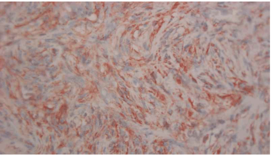 A 66-year-old male presented to our clinic with a two year history of progressively disabling dysphonia which had disrupted his career as a cantor. His physical examination was normal. Fiberoptic laryngoscopy revealed a bulging mass in the left paraglottic space extending to the vallecula and displacing the left vocal cord. A computed tomography (CT) scan was performed which demonstrated a 3.5 cm well delineated submucosal mass, located in the left paraglottic space and extending to the pre-epiglottic space and left vallecular region (Figures 1, 2). There was no evidence of cartilaginous destruction. Direct laryngoscopy revealed a firm and non-mobile mass. Due to this fact obtaining sufficient material with a punch biopsy forceps was technically impossible. Therefore, a surgical excision of the mass via a cervical approach was undertaken, with removal of the left thyroid cartilage lamina. Using this approach excellent exposure of the left paraglottic space containing the tumor was achieved. The mass was completely removed without any violation of the airway. Post-operative recovery was uneventful and an immediate improvement in the patient's voice quality was noted. Histological examination showed a well circumscribed mass composed of spindle cells with vesicular nuclei (Figure 3). The cells were arranged in short fascicles. Foci of storiform pattern, areas of hyalization and myxoid stromal changes were present. Branching vascular channels were also present. Immunohistochemical studies showed strong cytoplasmatic positivity of the cells for vimentin, CD 34 and bcl-2 (Figure 4), while staining for cytokeratin, desmin, actin and S100 were negative. A final diagnosis of solitary fibrous tumor of the larynx was given. | ||||||