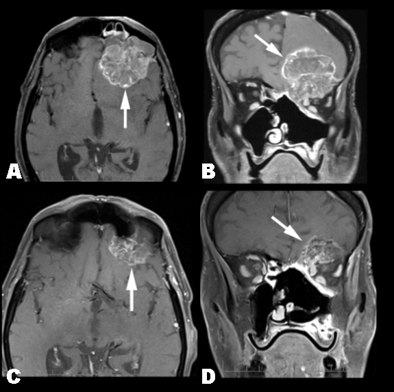 A 65-year-old wood carpenter presented in January 2008 with a several week history of progressive left nasal congestion despite repeated antibiotic treatment. His past medical history was significant for impaired right eye visual acuity since childhood, and a 15 pack year smoking history. The initial MRI brain and examination under anesthesia revealed a bulky bi-lobed T4aN0 tumor centered in the left ethmoid sinus and nasal cavity, extending into sphenoid sinus. There was no evidence of intracranial or perineural extension. Left nasal polyp biopsy confirmed sinonasal adenocarcinoma. The patient underwent lateral rhinotomy, bilateral sphenoidectomies, left maxillectomy and anterior and posterior ethmoidectomies. Histopathology reported an ulcerated, moderately differentiated, colonic-type adenocarcinoma, with clear margins. Adjuvant intensity modulated radiation therapy (60 Gy) was delivered to the surgical bed, with margins limited by proximity to the patient's functioning eye. In March 2010, the patient presented with nasal congestion, left proptosis, diplopia, and reduced left visual acuity. MRI brain showed an inoperable 48x45x48 mm intracranial mass arising from the dura of the left anterior cranial fossa floor, causing mass effect on the left frontal lobe with marked edema, midline shift, and inferior extension into the left orbit. CT and FDG-PET were consistent with the MRI findings. A repeat biopsy revealed moderately to poorly differentiated intestinal-type sinonasal adenocarinoma with immunoreactivity for CK20, CDX-2, and minimal CK7 immunoreactivity. Treatment with FOLFOX6 chemotherapy (oxaliplatin 100 mg/m2; 5-FU 400 mg/m2 bolus followed by 2400 mg/m2 infusion over 46 hours) was initiated based on the rationale of similar morphology and immunohistochemistry (IHC) of this patient's sinonasal intestinal-type adenocarcinoma and colon adenocarcinoma and the affirmed efficacy of FOLFOX regimens in the metastatic and adjuvant colon cancer settings. In total, 12 cycles of FOLFOX6 chemotherapy were administered over six months prior to ceasing treatment on account of treatment related toxicities. The oxaliplatin dose was reduced by 15% after five cycles due to grade 2 peripheral neuropathy. Clinically, the patient had resolution of his nasal congestion, diplopia, and left proptosis, although his left visual acuity remained unchanged. Interim MRIs during treatment showed progressive shrinkage of the primary tumor, reduced mass effect in the left frontal lobe, and resolution of the midline shift and ventricular compression. After 11 cycles of FOLFOX chemotherapy, the primary lesion measured 22.8x17.3x23.3 mm consistent with a partial response by RECIST criteria (Figure 1). Moreover, the majority of the T2 bright tumoral signal resolved suggesting fibrosis. Finally, tumor was no longer detected in the frontal sinus and superior orbital fissure, and there was significant intranasal and left globe tumor regression. Repeat MRI imaging two months after FOLFOX chemotherapy demonstrated progressive disease. Treatment with weekly paclitaxel was given over two months with subsequent further disease progression. Due to a decline in performance status, FOLFOX was not re-initiated, and the patient died six months thereafter. | ||||||