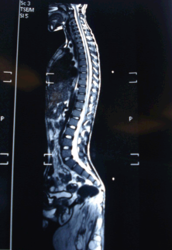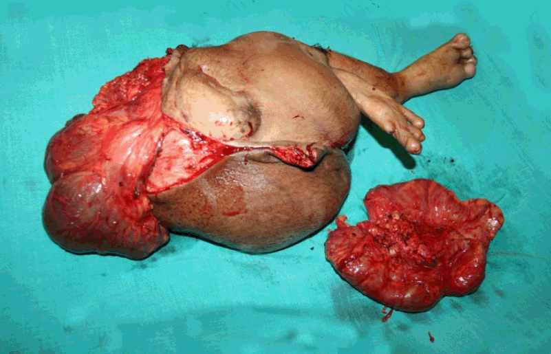 A 16-year-old boy presented in the outdoor department of our institute with history of malformation attached to his lower back since birth. The boy was born 16 years back, with history of vaginal breech delivery at home with prolonged labor. At birth the infant had irregular mass in his lower back covered by a membrane which ruptured in few weeks to reveal a malformation initially interpreted as supernumerary limbs which has grown in size with the growth of child . The boy had difficulty in performing daily routine activities including unable to dress properly and lie in supine. The patient was of average built and nutrition; vitals were normal and had mild pallor. The sacral portion of the spine was deformed protruding backward at an angle of about 45 degrees, underneath to which was attached a malformation. This malformed structure had well appreciable lower limbs with toes and nails although no movements were recorded in these limbs either spontaneous or upon stimulation. There were nipples, hairs, and pubic hair area and skin ulceration of size 6x7 cm noticed over malformation (Figure 1). The patient was undertaken for detailed radiological examination including ultrasound abdomen, Contrast enhanced computed tomography of abdomen and MRI spine. These investigations did not reveal any gross communication of malformation with the abdominal cavity or spine of the patient (Figure 2). The surgical excision of the malformation was performed without any significant complication. The malformation was mostly exterior with extension in the presacral space displacing sacrum posterior, there was no direct communication in the abdomen or spinal canal of the patient and gluteal muscles of the patient were ill developed. The main vascular supply of the malformation was from middle sacral artery of the patient. The surgical specimen was subjected to detailed pathological examination, which consisted of ill developed pelvis, both lower limbs with bones, toes and nails, two blind loops of intestine, both nipples and pubic hairs (Figure 3). There was no other major solid organ or internal genitalia in the specimen while the rest of it consisted of mostly fat, muscles and cavities filled lymph like fluid. Based on history, clinical presentation and pathological findings the malformation was diagnosed as an exoparasitic heteropagus twin. | ||||||