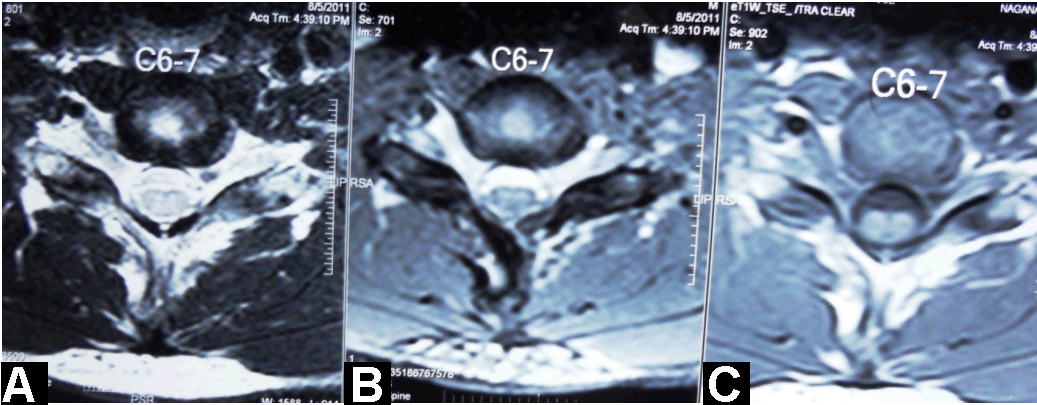 A 26-year-old male presented with progressive weakness and wasting in the distal muscles of both the upper limbs for last seven months. He noticed weakness while lifting dumbells, and later developed difficulty in handling small utensils and writing. He had no sensory symptoms. There was no preceding illness, trauma, exposure to toxins. His past medical history was noncontributory; he denied any allergic disease and none of his family members had similar symptoms. Neurological examination showed significant muscle loss of both upper limbs involving all muscle groups except for the deltoid and brachioradialis muscles. Strength was reduced in the finger extensors, abductor digit mini, flexor pollicis longus, abductor pollicis brevis, pronator teres and ulnar innervated muscles. Strength in lower limbs muscles was normal. Deep tendon reflexes were normal except slight hyporeflexia in triceps, the knee jerks were brisk bilaterally. Plantars were flexors. Mild action tremor was seen in fingers. Higher mental functions, gait, cranial nerves, cerebellar functions, and sensory examination were normal. There was no evidence of polyminimyoclonus or autonomic disturbances. The hematological investigations were normal. Cerebrospinal fluid showed glucose: 52 mg/dL, proteins: 13 mg/dL, and white cells: 4/mm3. Serum IgE was within normal limits. Electrophysiologic studies showed decreased amplitude in ulnar nerves with normal latencies and borderline low velocities; giant motor unit action potentials were seen in the muscles innervated by C7, C8 and T1 nerve roots, with fibrillations and positive waves. There was no evidence of conduction block. Plain cervical spine radiograph showed no abnormality and no misalignment of vertebral bodies. The magnetic resonance imaging (MRI) of the cervical spine in neutral position showed mild atrophy with mild loss of attachment between posterior dural sac and subjacent lamina of cervical cord at C6–C7 (Figure 1). On flexion view MRI cervical spine, there was anterior displacement of the dural sac and spinal cord with widening of posterior epidural space with engorgement of epidural veins (Figure 2). The axial sections showed anteroposterior flattening of the cord with intrinsic signal changes (Figure 3). Clinical, radiological and electrophysiologic findings in our patient were consistent with the diagnosis of bilateral symmetric Hirayama disease. The patient was advised to wear a soft cervical collar. On a three-month follow up the patient had shown no progression of his disease. | ||||||