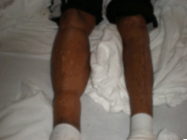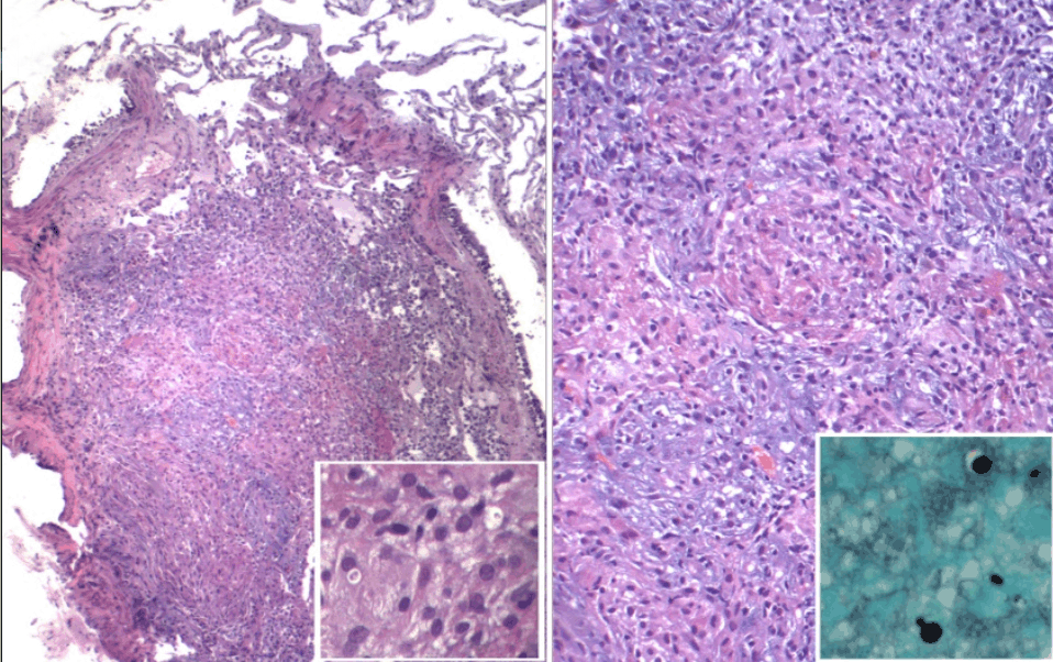 A 57-year-old African-American male presented to our hospital with a one week history of progressive right lower extremity pain and swelling, associated with fevers, chills and night sweats. Review of systems revealed a one week history of dry cough and right-sided pleuritic chest pain. He received an orthotopic liver transplant four months earlier at our institution for end stage liver disease and cirrhosis secondary to Hepatitis C. After transplantation, his maintenance immunosuppressive regimen included tacrolimus (2 mg every morning, 1 mg every evening), and mycophenolate mofetil (1000 mg twice daily). On admission, he was afebrile. His right lower extremity was exquisitely tender to palpation; erythema, warmth and 2+ pitting edema were also noted (Figure 1). No nodules, ulcers, pustules or papules were noted on the lower extremities. His white-blood-cell count was 9900 cells per uL, with 85% neutrophils and 2% bands. Radiography of the right lower extremity did not reveal a fracture and an ultrasound did not demonstrate a deep vein thrombosis. Chest X-ray revealed a new nodular density in the right mid-lung. Computed tomography (CT) scan of the chest was obtained and revealed multifocal pneumonia (Figure 2). Vancomycin and cefepime were initiated empirically for suspected bacterial cellulitis and pneumonia. Despite 48 hours of antibiotic therapy, the patient's symptoms failed to improve. Serum cryptococcal antigen was obtained and the titer was positive at 1:10. A skin biopsy was performed and revealed necrotizing granulomas, with the GMS stain revealing yeasts. Bronchoscopy and transbronchial biopsy also showed yeasts (Figure 3). C. neoformans was subsequently isolated from his bronchoalveolar lavage. Lumbar puncture was performed and the CSF was unremarkable. The patient received liposomal amphotericin B at 3 mg/kg per day for two weeks, during which time tacrolimus dosing was decreased by 50% and mycophenolate mofetil was discontinued. Improvement in cellulitis and pulmonary infiltrates was noted and he transitioned to oral fluconazole. His tacrolimus dosing remained reduced for the first three months of therapy as an outpatient. The patient completed a 12-month course of fluconazole and has not demonstrated relapse to date. | ||||||