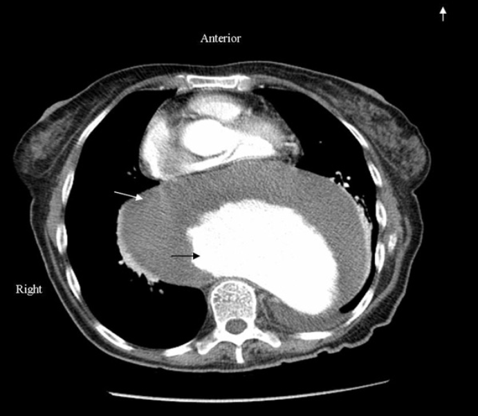 A 76-year-old female presented to primary care physician with a complaint of progressive dyspnea on exertion for three months. She denied chest pain, dizziness or back pain. She had been smoking two packs of cigarette per day for 50 years and had history of gastroesophageal reflux disease. Physical examination revealed decrease breath sounds in left lung field. Cardiac examination was unremarkable. Chest X-ray showed a large mass within the mediastinum and the left hemithorax (Figure 1). A contrast enhanced chest computed tomography scan demonstrated a large thoracoabdominal aortic aneurysm (TAA) measuring 11 cm at its greatest diameter in thorax compressing the left atrium (Figure 2). Circumferential thrombus was surrounding the true lumen but no contrast extravasation or leak was noticed. She was transferred urgently to our facility for further management. After complete preoperative work up repair of the thoracoabdominal aneurysm was planned. | ||||||