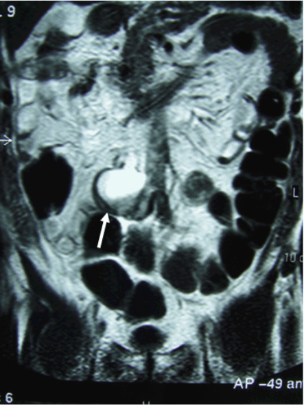 Appendiceal mucoceles are defined as a group of lesions in which the appendiceal lumen becomes distended with mucus. The lesions are histopathologically divided into three subtypes: mucosal hyperplasia, mucinous cystoadenoma, and mucinous cystadenocarcinoma. [4] Appendiceal mucocele is a comparatively rare disease and it often remains asymptomatic during the clinical course, and the disease itself has been accepted to be a neoplasm with low grade malignant potential, other than cystadenocarcinoma associated with pseudomyxoma peritonei. Tumorous lesions including GIST, carcinoid tumor, lymphoma, primary cancer, and metastasized carcinoma usually metastasize from extra-intestinal melanoma; lung cancer and breast cancer have been reported as causal lesions for obstruction of the small intestine. [5] [6] Although there are a few reports of intussusception caused by appendiceal mucocele, [7] [8] small bowel obstruction caused by a simple compression of appendiceal mucocele has been rarely presented. [9] Magnetic resonance imaging demonstrated a cystic lesion obstructing the ileum in the current patient, and a GI series showed the intestinal obstruction was far from the terminal ileum. These findings suggested that a cystic tumor in the small intestine or an appendiceal mucocele. While no definitive diagnosis could be made preoperatively and the latent possibility of cystadenocarcinoma could be also considered as a differential diagnosis. An absolutely perfect dissection of the cystic lesion without any injury is required to avoid peritoneal dissemination, [10] especially in case of appendiceal cystadenocarcinoma in association with an aggressive pseudomyxoma peritonei. [11] A conventional laparotomy was performed in the current case, and the lesion was eventually diagnosed as cystadenoma of the appendix. The patient recovered with no adverse events. | ||||||