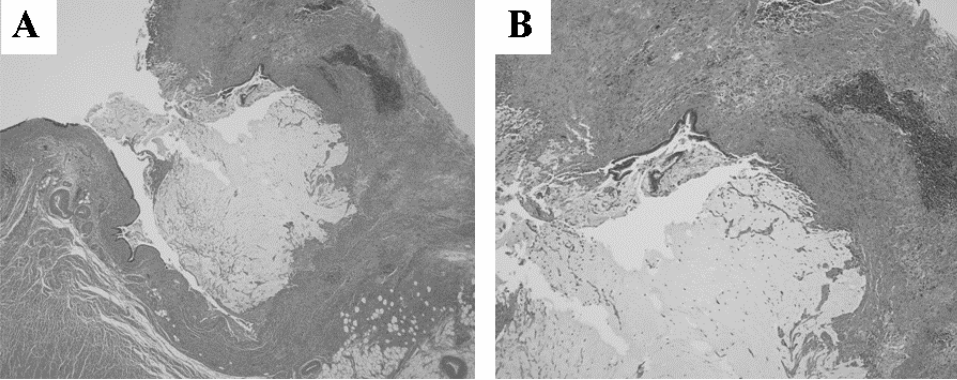 A 74-year-old male came to our institute with complains of abdominal pain and vomiting. He had no previous history of laparotomy. A long tube was inserted to reduce the symptoms of abdominal fullness and a small bowel series demonstrated a complete obstruction of the ileum (Figure 1). Magnetic resonance imaging (MRI) suggested a cystic lesion that might be correlated with the small bowel obstruction (Figure 2). Laparotomy revealed a cystic lesion located in the ileum, 80 cm from the terminal ileum causing a complete compression of the small bowel. Moreover, the entire cystic lesion was continuous with the appendix, a partial resection of small bowel and appendectomy was performed. The cystic lesion was found on the edge of the appendix (Figure 3A). Although the lumen of the ileum was completely occluded by the cystic lesion, the mucosa of the ileum was not involved with the tumor (Figure 3B). The cystic lesion contained the transparent mucin (Figure 3C). The wall of the cystic lesion was lined with intestinal epithelium without atypia associated with chronic inflammation of the appendiceal mucosa and there was mucin secreting epithelium lining the appendix (Figure 4). The lesion demonstrated the pathological features of mucinous cystoadenoma of the appendix. | ||||||