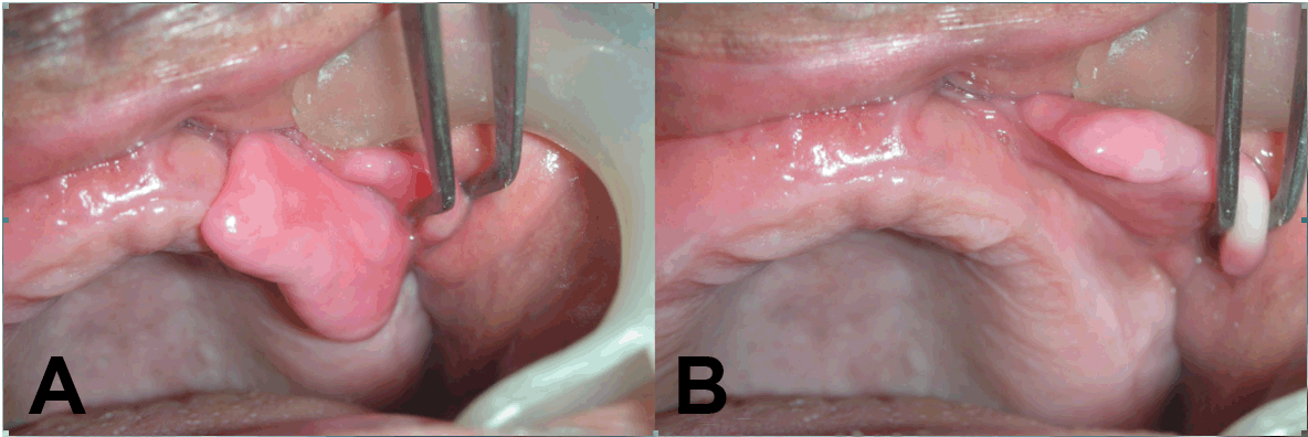 Epulis fissuratum is essentially one of overgrowth of fibrous tissue from vestibular mucosa, that most commonly develops when a full denture or partial denture flange begins to impinge/irritate on the tissues in this area. It must be surgically removed with scalpel, electrosurgery or lasers. As a component of the treatment, the denture must usually be re-made or substantially adjusted to prevent recurrence.