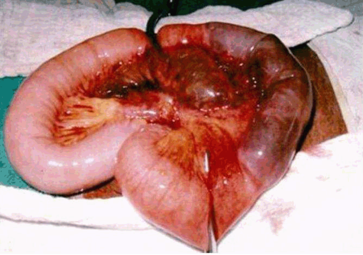 A 65-year-old man of Asian origin presented with sudden onset of abdominal pain, abdominal wall lump and vomiting of six hours duration. Four years back, he had transurethral resection of the prostate. Two years after prostate resection, he had retention of urine due to urethral stricture, for which he had SPC. On examination he was hemodynamically stable. Abdominal examination revealed a tender swelling at the SPC scar site which was about five cm above the symphysis pubis. The swelling was tense and tender. (Figure 1) Clinical diagnosis of a strangulated incisional hernia through the SPC scar was made. Plain abdominal X-ray confirmed small bowel obstruction. The decision was made to undertake an urgent local exploration of the swelling. The local exploration was done though a vertical incision in the abdominal wall. It confirmed a hernial sac with strangulated small bowel within the sac. (Figure 2) The defect was three cm in diameter. It was widened for exposure of the surgical site. Small bowel resection and a hand sewn end to end primary bowel anastomosis were performed. The hernial defect was repaired using interrupted, non-absorbable sutures. No drain was required and the patient had an uneventful postoperative recovery. | ||||||