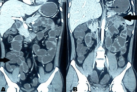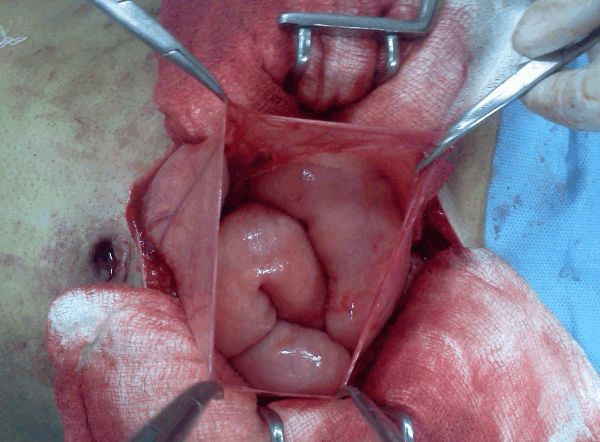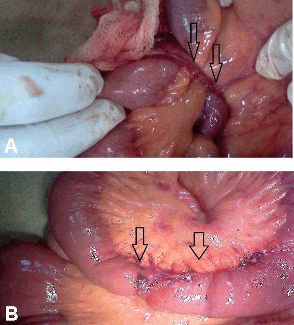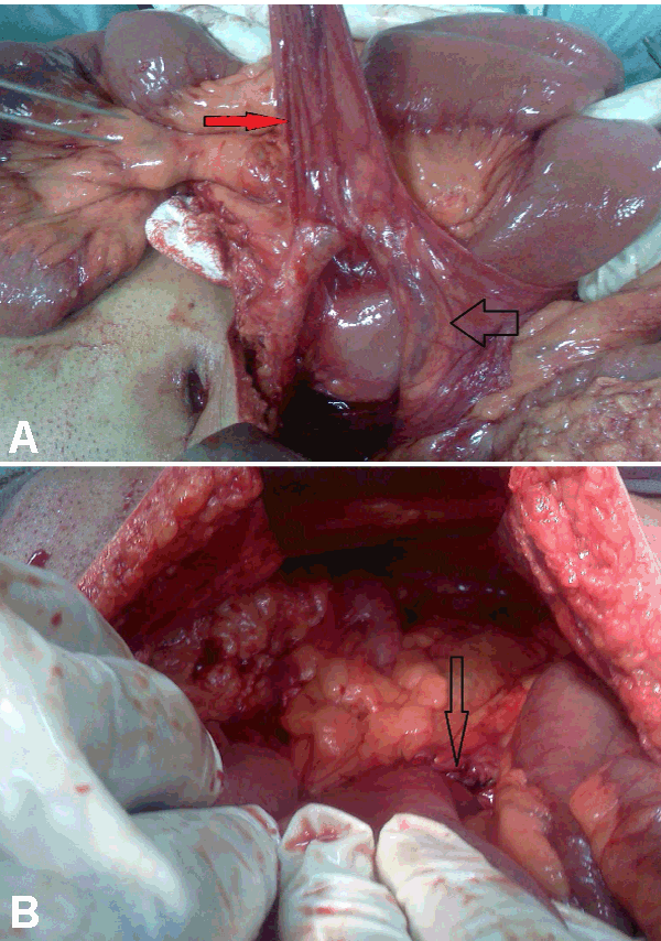 A 28-year-old male presented with generalized abdominal pain, fever and multiple episodes of vomiting. Abdominal pain was episodic and colicky and vomitus was bilious. There was no past history of trauma or surgery. Patient had a past history of three episodes of similar abdominal pain and vomiting three months back. Second episode occurred 12 days after the first episode and third episode occurred 21 days after first episode. Patient was diagnosed as a case of recurrent sub-acute intestinal obstruction by small gut stricture which was confirmed on the barium study at that time. During and after each episode the patient was managed conservatively without any surgical intervention. General physical examination during current episode showed dehydrated appearence, pulse 96/min, blood pressure 110/70 mmHg, and temperature of 99oC. Systemic examination was normal. Abdominal examination revealed distended abdomen, diffuse tenderness and a high pitch bowel sounds. Laboratory parameters were normal. X-ray of abdomen showed multiple air fluid levels. Computed tomography scan of the abdomen revealed conglomeration of gut in a thin sac suggestive of peritoneal encapsulation on the right side. There was displacement of inferior mesenteric vein and the entrapped bowel in left upper abdomen (left paraduodenal hernia). (Figure 1A–B) Gut loops were dilated and had thick walls. Exploratory laparotomy revealed encasement of bowel loops in membrane, typical of peritoneal encapsulation with inter-loop adhesions present in the bowel outside the peritoneal sac. (Figure 2) Gut inside peritoneal encapsulation was dilated, which was suggestive of obstruction. Malrotations of small gut loops was seen. After careful dissection of the membrane, adhesiolysis and release of omental adhesions, a vessel lying on ileal loops, outside the retroperitoneum, was seen which was identified as inferior mesenteric vein (IMV). (Figure 3A-B) The bowel proximal to the abnormally placed IMV was dilated with thickened wall which was suggestive of obstruction. This abnormally lying IMV was constrained by adhesions to small bowel. Peritoneal encapsulation and retroperitonealization of IMV were leading to sub-acute intestinal obstruction. Further exploration revealed a loop of intestine impacted in a left paraduodenal fossa. Diagnosis of the left paraduodenal hernia was confirmed. (Figure 4A-B) Incarcerated segment of bowel in left paraduodenal fossa had signs of strangulation with thickened walls leading to acute abdomen. Resection of incarcerated segment and the closure of hernial orifice was done. Retroperitonealization of anteriorly placed IMV was achieved. Postoperative period was uneventful and patient was discharged after one week. Patient is well on follow up for last 13 months. | ||||||