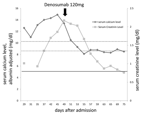 Denosumab, a human monoclonal antibody that binds to and neutralizes the receptor activator of nuclear factor-& #954; ligand (RANKL), has recently become available for the prevention of skeletal-related events (SRE) of bone metastases from breast cancer. In a recent study, denosumab was shown to be more effective than zoledronic acid in delaying SRE [1], and it has been shown that hypocalcemia occurred more frequently and renal failure less frequently, in patients treated with denosumab as compared to those treated with zoledronic acid [1-3]. In light of these studies, we used denosumab to successfully treat a patient presenting with acute renal failure caused by a tumor-related hypercalcemia arising from breast cancer bone metastases. A 53-year-old woman was admitted to the orthopedics ward due to walking difficulties. Investigations revealed compression of the spine by metastatic carcinoma of the thoracic vertebrae. An emergency decompression surgery was performed. Pathological examination of the resected specimen revealed metastatic carcinoma of probable breast cancer origin that was immunohistochemically positive for estrogen receptor, negative for progesterone receptor, and 2+ for HER2 receptor (additional fluorescence in situ hybridization revealed significant amplification of HER2/neu). The patient had undergone surgery for left breast cancer 13 years ago in our hospital and had shown no evidence of recurrence at her last visit to the outpatient clinic three years ago. A positron emission tomography (PET) scan after the decompression surgery revealed multiple bone metastases (in the thoracic and lumbar vertebre, sternum, humeri, scapula, ribs, pelvis, and femur). Lung metastasis and serum calcium level started to increase 29 days after admission. Tumor-related hypercalcemia was strongly suspected and the patient was treated with elcatonin (80 U/day), normal saline (1,000 ml/day) and furosemide (40 mg/day) for six days from day 29, but the serum calcium level continued to increase and renal dysfunction developed (Figure 1). The patient developed severe appetite loss and renal dysfunction with creatinin clearance of 26 ml/min. With these findings a diagnosis of acute renal failure due to tumor related hypercalcemia was made. Usually, we use zoledronic acid to treat tumor-related hypercalcemia, but it could not be used in this case because of renal dysfunction. As an alternative, on day 49, we administered single dose of denosumab (120 mg) to treat the acute renal failure caused by tumor-related hypercalcemia. The serum calcium level decreased to within normal limits after only five days, and renal functions improved and completely recovered after a month (Figure 1). The patient is now under treatment with exemestane and trastuzumab. Denosumab is still being administered every four weeks and the serum calcium level and renal function are stable owing to a daily intake of 600 mg calcium and 0.25 µg vitamin D, respectively. Enhanced bone resorption is the primary cause of tumor-induced hypercalcemia. The release of tumor-derived mediators induces this increase in osteoclast-mediated resorption. The interaction between osteoclasts and cancer cells are mainly mediated by parathyroid hormone-related protein (PTHrP), that activates osteoblasts to produce RANKL which stimulates osteoclast differentiation [4]. Denosumab, human RANKL antibody inhibits this vicious cycle. Moreover, denosmab binding to RANKL is metabolized by peptides and cleared by the reticuloendothelial system and probably does not have a nephrotoxic effects [5]. Zoledronic acid, one of the third generation bisphosphonates, also inhibits the effect of RANKL and is used for treatment of tumor-related hypercalcemia, but cannot be used for patients with renal dysfunction (with creatinin clearance <30ml/min). Use of denosumab for such a condition is limited [5], but it may be a reasonable treatment choice in certain circumstances, such as those outlined here. |