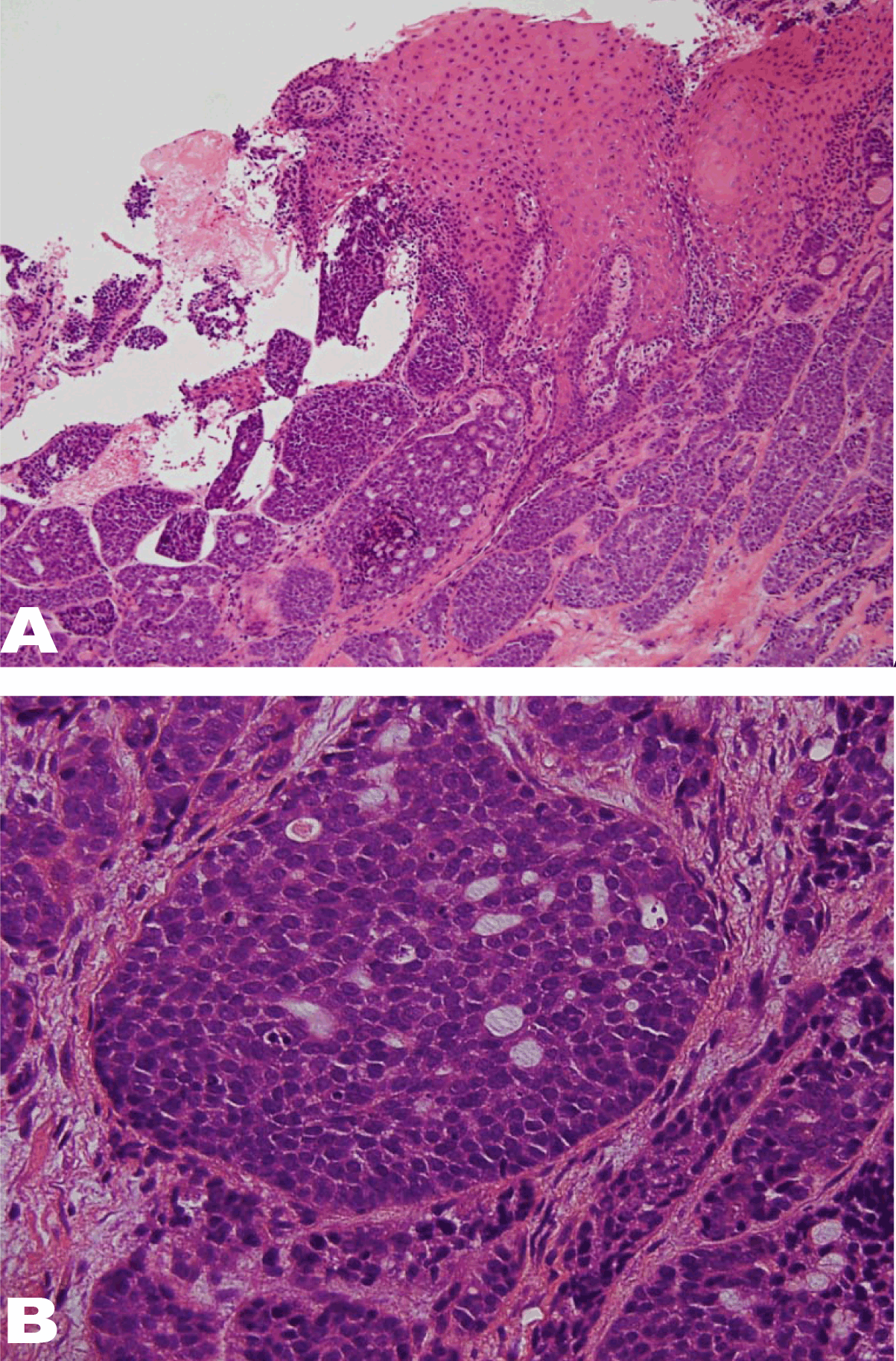 Case 1: A 49-year-old Japanese male was referred to the Department of Oral and Maxillofacial Surgery at Tsukuba University Hospital with a 3-month history of a mass lesion in his left soft palate. He had a medical history of gout. Examination of the oral cavity revealed a red, irregular granulation-like mass in the soft palate towards the retromandibular region. (Figure 1) The regional lymph nodes were normal. A chest X-ray revealed no lung metastasis. An incisional biopsy performed under local anesthesia was histopathologically diagnosed as BSCC. Microscopic examination showed epithelial-like and basaloid tumor cells with an alveolar architecture and peripheral palisading, hyperchromatic nuclei with a high nuclear/cytoplasmic (N/C) ratio, and frequent mitosis. (Figure 2) The patient was clinically and radiologically classified as T3N0M0 (Stage III). The patient underwent chemoradiotherapy with a total delivered dose of 66.6 Gy along with 5-fluorouracil and cisplatin or nedaplatin. More than eight years after radiotherapy, the patient is alive without evidence of recurrence. | ||||||