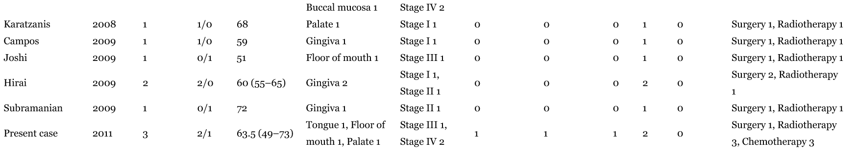 Case Series: We here present three cases of oral BSCC. Case 1: A 49-year-old male was clinically and radiologically classified as T3N0M0 (Stage III). He underwent chemoradiotherapy and more than 8 years after treatment, the patient is alive without evidence of recurrence. Case 2: A 69-year-old female was classified as T4aN0M0 (Stage IVA). She underwent chemoradiotherapy, and died from lung and liver metastasis 4 years and 3 months after her first visit. Case 3: A 73-year-old male was clinically and radiologically classified as T2N2cM0 (Stage IVA). The patient underwent chemoradiotherapy and bilateral neck dissection. More than about 5 years after surgery, the patient is alive without evidence of recurrence. Discussion: About a hundred cases of oral BSCC have been reported, and we review previous reports of oral BSCC cases. Oral BSCC has a lower rate of distant metastasis than head and neck BSCC. Conclusion: In contrast to the aggressive behavior of BSCC occurring in the head and neck, BSCC occurring in the oral cavity appears to have a lower rate of distant metastasis than head and neck BSCC. When it comes to the follow-up of patients for metastases, a more thorough work-up is recommended for patients with oral BSCC than for patients with SCC. | |