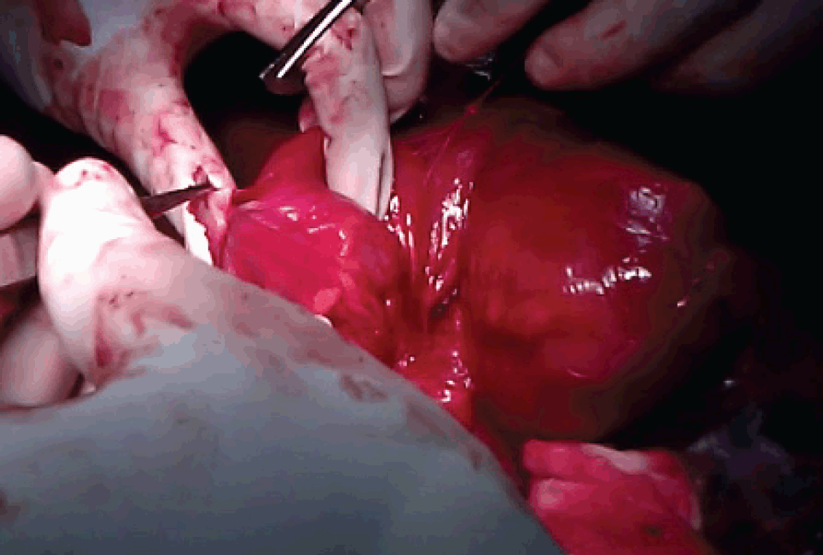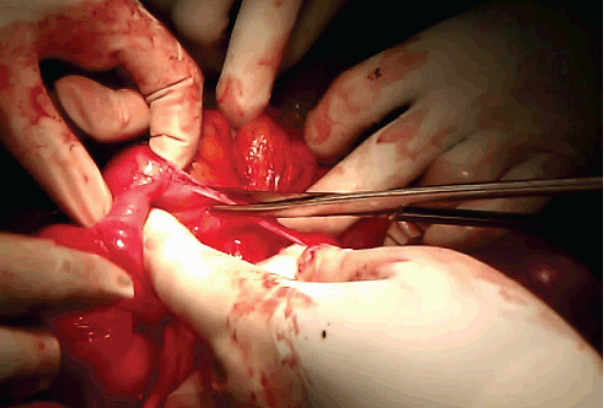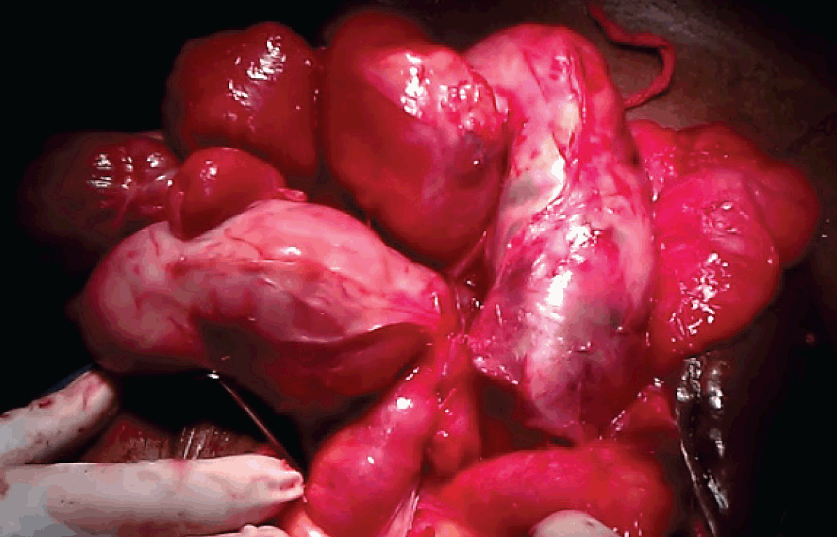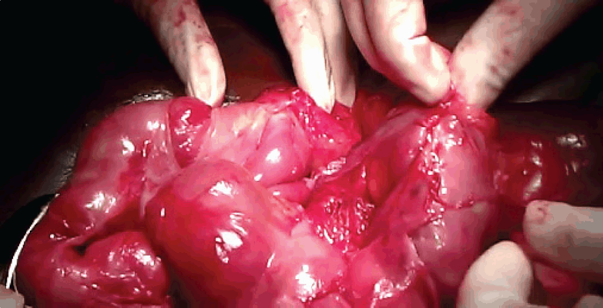 A 30-year-old male presented with vague complains of intermittent abdominal pain and back pain, nausea, vomiting and abdominal distension. He had undergone laparoscopic appendectomy five months ago. He had been having similar complaints before and after the surgery. No records about the operative findings in the previous surgery were available with the patient. On examination, his abdomen was distended with generalized tenderness in all quadrants. No free fluid in the abdomen made out on clinical examination. No mass or hernia was present in port sites. On auscultation, bowel sounds were sluggish. Initially the diagnosis was suspected as adhesive obstruction and was started on conservative management without symptomatic relief even after 12 hours. Blood counts were within normal limits. Computed tomography (CT) scan of abdomen showed all small bowel loops except duodenum and distal ileal loops were encased within a sac like structure with various thickness and small bowel showed signs of obstruction but no radiological evidence of mesenteric ischemia and suggested it to be a case of internal hernia or abdominal cocoon. (Figure 1) Radiologist suggested patient to be a case of internal hernia or abdominal cocoon causing intestinal obstruction. Since patient did not respond well for conservative management, he was taken up for laparotomy. Per operatively thick membrane noted just after opening up the parietal peritoneum which had to be opened to visualize intestines. Inner aspect of entire peritoneal cavity, both parietal and visceral peritoneum was covered with a membrane of variable thickness and in some places membrane was adherent causing intestinal obstruction. (Figure 2) Membrane causing obstruction were released with sharp dissection (Figure 3) and samples taken by peeling off the membrane from small bowel for biopsy. (Figure 4) Since entire peritoneal cavity was covered with membrane, it could not be totally removed. (Figure 5) Postoperative period was uneventful. Histopathological examination of the membrane showed nonspecific inflammatory cells with fibrosis. | ||||||