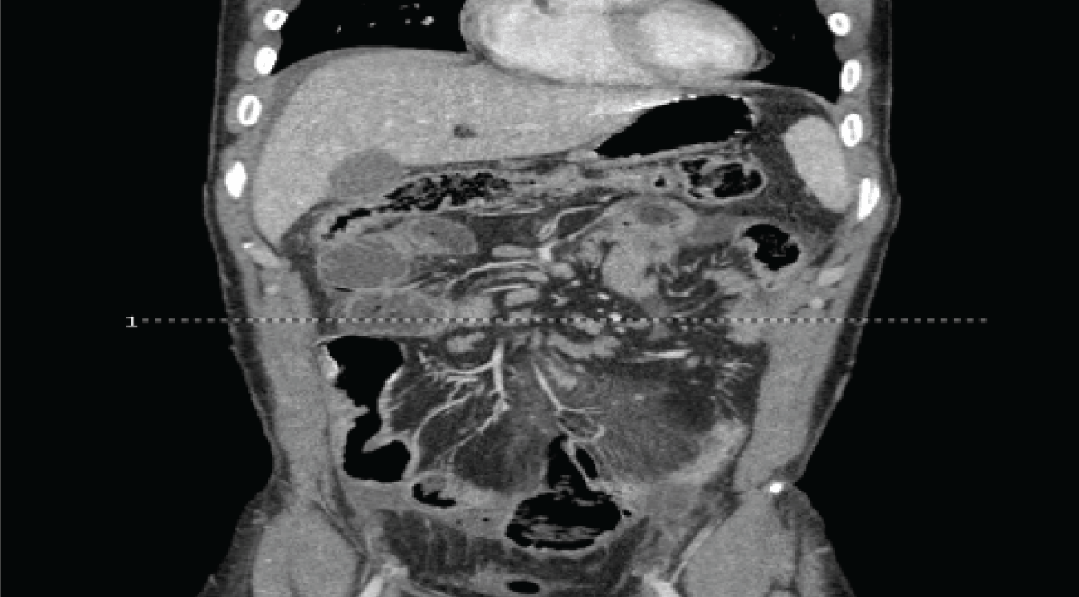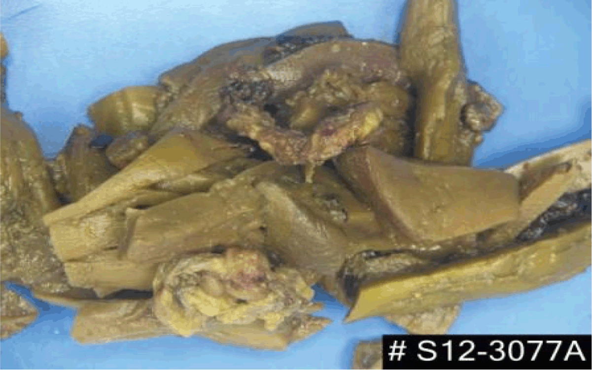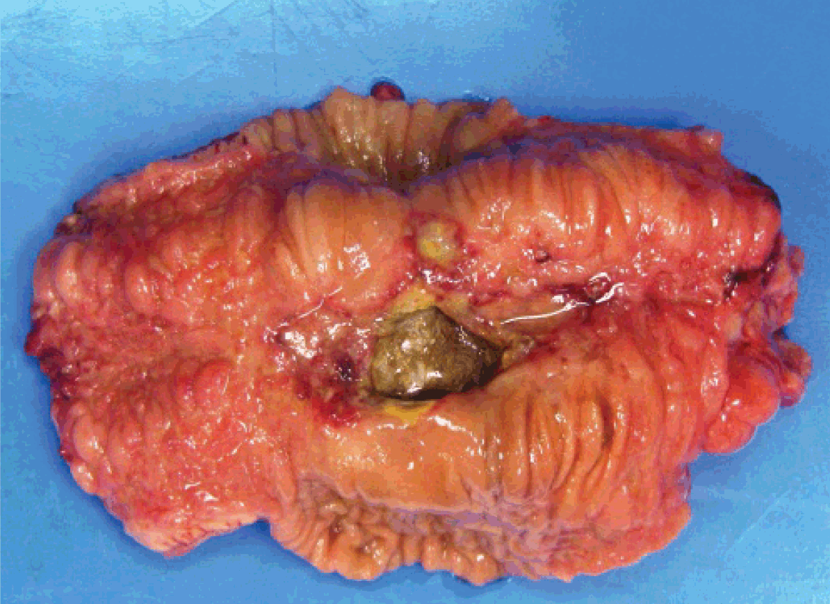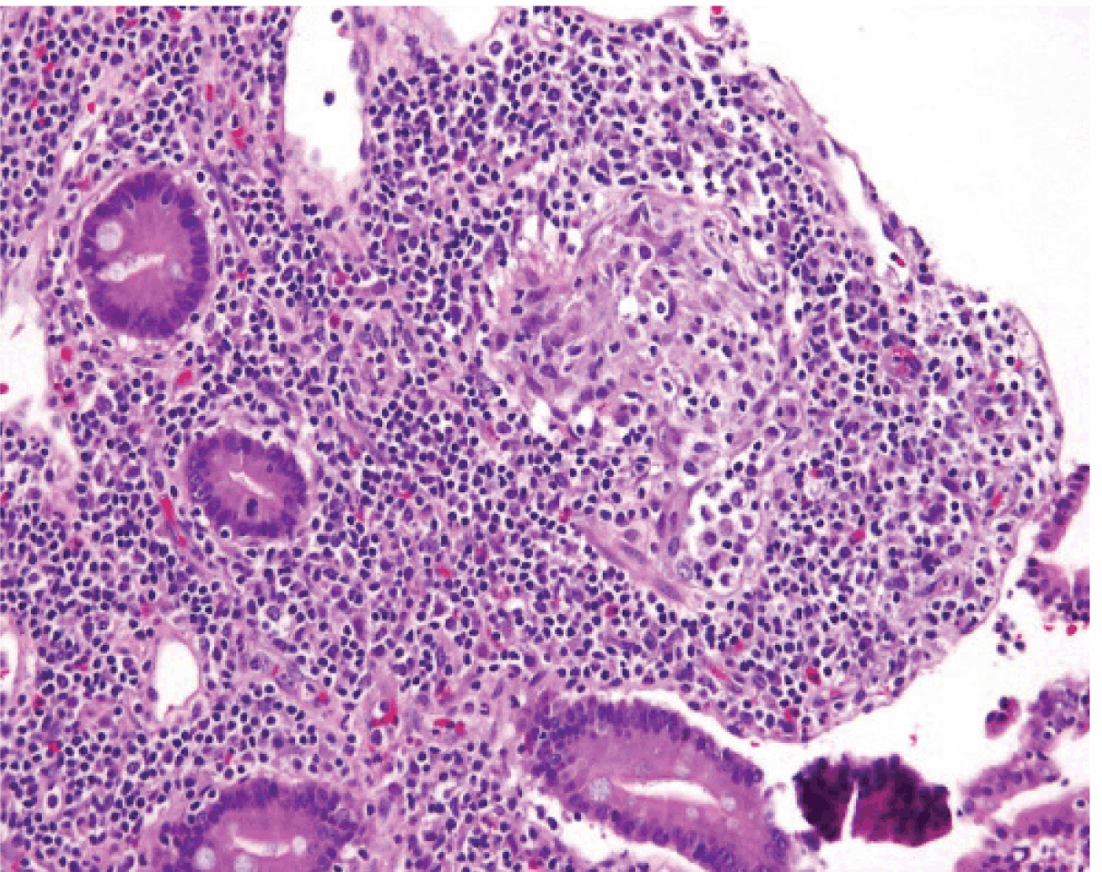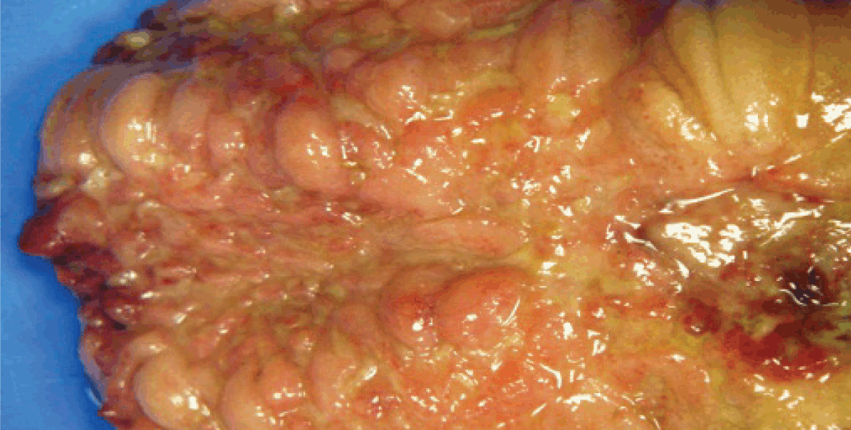 A 34-year-old Caucasian male with no past medical history presented with a one-day history of acute onset lower abdominal pain, nausea and vomiting. He denied any previous change in bowel habits, tenesmus, blood or mucus in his stools, weight loss or fevers or any urinary symptoms. He had no previous medication or surgical history. Family history was positive for celiac disease. He drank an average of two alcoholic drinks a day, five times per week. He denied the use of tobacco or any illegal drugs. On physical exam, the patient was in severe pain and unable to find a comfortable resting position. Abdominal exam revealed tenderness in the infra-umbilical and supra-pubic regions. The abdomen was non-distended with voluntary guarding, but no rebound. Bowel sounds were present. Rectal examination showed normal sphincter tone without any masses. There was no costovertebral angle tenderness. Physical examination was otherwise normal. Laboratory findings showed normal electrolytes. Complete blood count revealed a normal white blood cell count with a mild neutrophilia 81% and hemoglobin 12.7 g/dL. Lipase was 7 U/L. Urinalysis was normal. Hepatitis B workup revealed immunization induced immunity. ANCA profile was negative. Computed tomography (CT) scan of abdomen and pelvis revealed lower abdomen bowel rupture with associated mesenteric inflammation, fecal matter, emphysema and adenopathy. (Figure 1) It was noted that there was thickened small bowel concerning for inflammatory bowel disease. There was also mid bowel focal ileus and splenomegaly. The appendix was not visualized. The patient was taken for exploratory laparotomy. A perforated loop of jejunum was located 80 cm distal to the ligament of Treitz. (Figure 2) Solid unmasticated mushrooms were found adjacent to the perforation. (Figure 3) The segment was resected and then primary jejunal anastamosis was performed. Gross examination of the respected intestine demonstrated a diseased segment measuring 3.3 cm. A perforation measuring 2.8x1.5 cm was located in this segment. The lumen appeared somewhat smaller in the diseased portion of the bowel with a thickened wall and showed some mucosal ulceration. The diseased thickened portion had a hyperemic mucosa and a cobble stone appearance. (Figure 4) The remainder of the bowel appeared to be normal. Microscopically the resected segment of the specimen demonstrated transmural inflammation with extensive pinpoint mucosal ulceration along with cobble stone linear ulcers, fistula tracts and a large area of perforation. Inflammatory pseudo-polyps were numerous. Multiple lymphoid hyperplasia with germinal centers (strings of pearls), occasional granulomas and a rare crypt abscess was noted. (Figure 5) All these findings were suggestive of Crohn’s disease. Patient has a relatively benign postoperative course. He was managed conservatively until normal bowel function returned. The plan was to begin therapy for Crohn's disease prior to discharge pending the pathology report and to perform colonoscopy six weeks after discharge. Unfortunately, the patient opted to follow-up at another institution for convenience. | ||||||