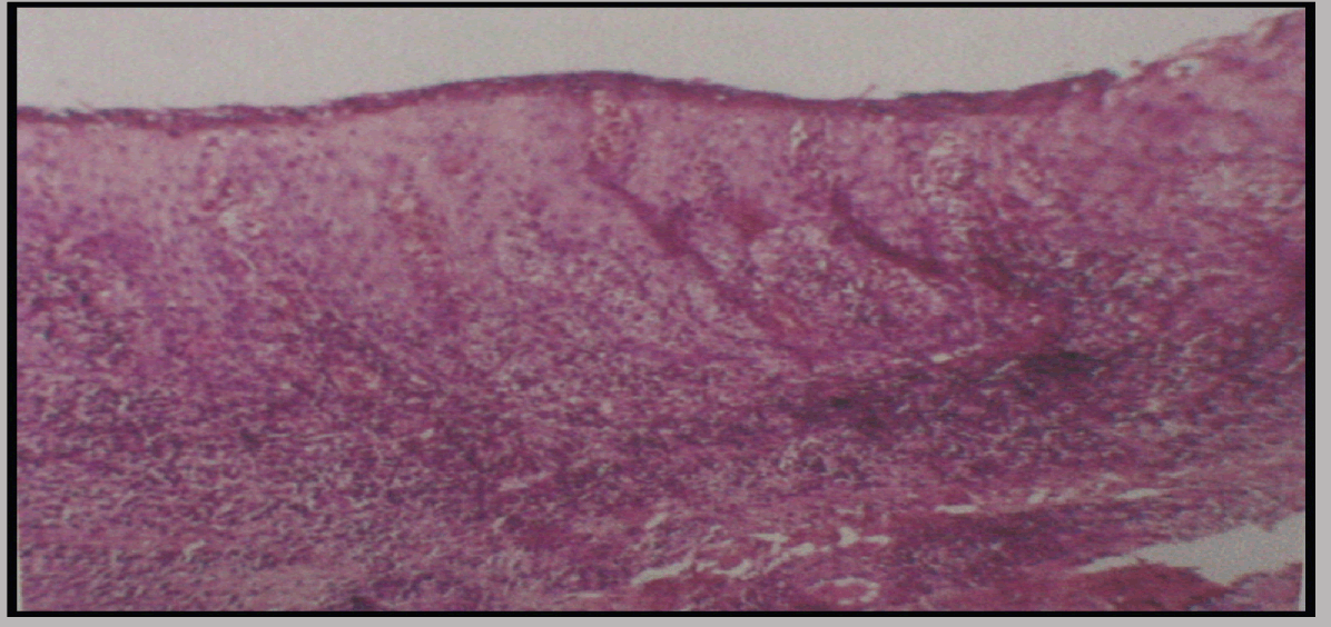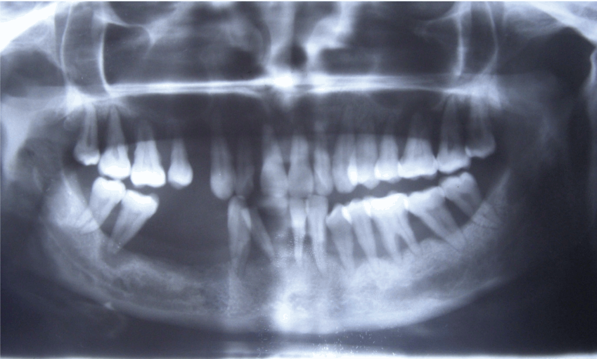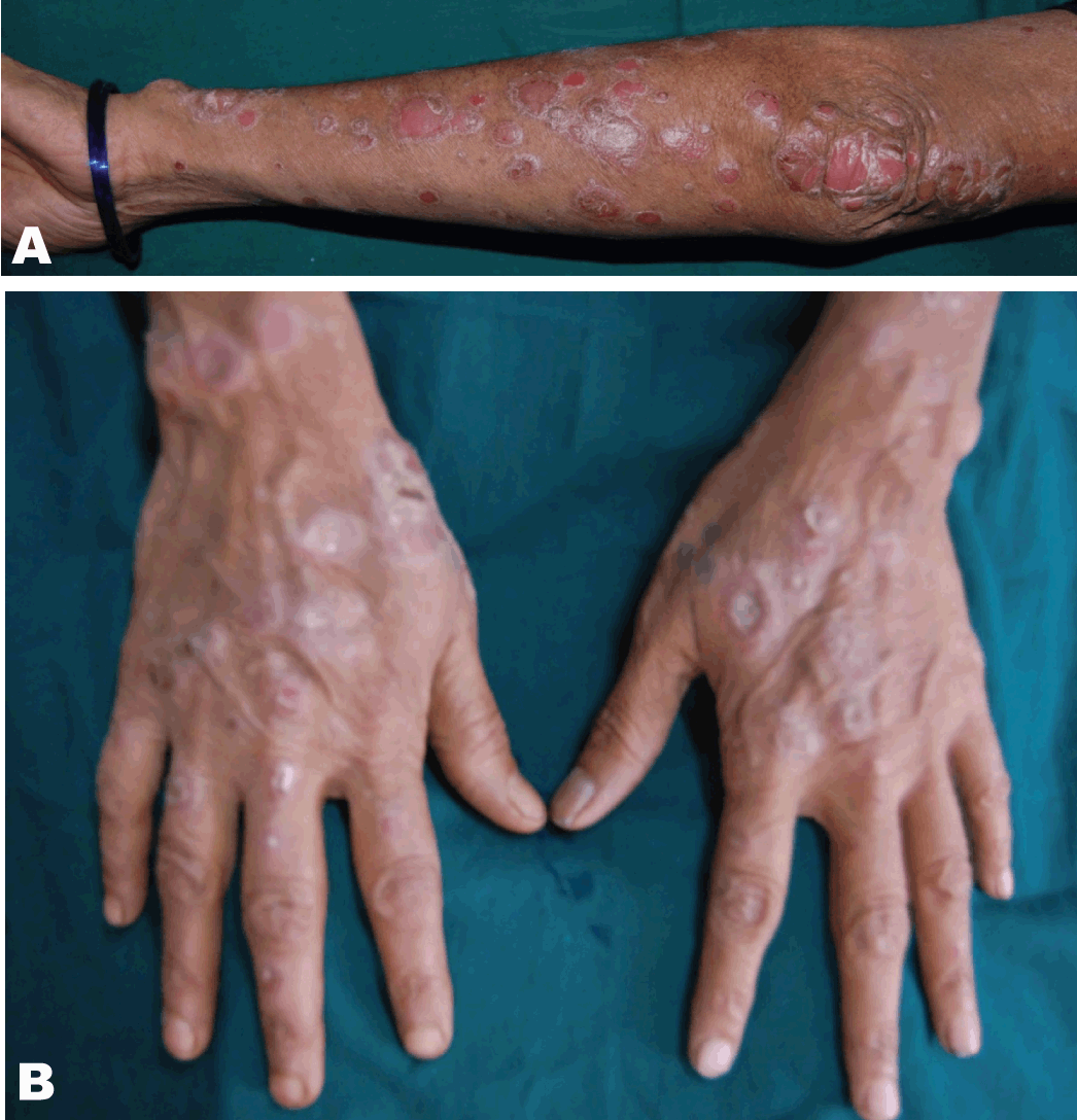 A 45-year-old female presented to the Department of Periodontics, M.S. Ramaiah Dental College and Hospital, Bangalore, with a complaint of loosening of upper and lower front teeth since two months. It was associated with intermittent pain since two months. Her medical history revealed that she was a known case of psoriasis past 22 years. She was allergic to penicillin. Her family history was positive for psoriasis and she was on medication for same. Scaly type cutaneous lesions, whitish to red in color, were seen on the extensor aspect of forearms, legs, and also the scalp. (Figure 1) (Figure 2) An intraoral clinical examination presented missing teeth i.r.t 15, 31, 32, 44, 45 and 46. Oral hygiene was poor with increased local factors. There was generalized gingival inflammation with increased tendency to bleed on probing. Periodontal examination revealed probing depth of 8–10 mm. All the remaining teeth were found to be in compromised periodontal health with generalized Grade III mobility. There was also generalized recession present. (Figure 2) Orthopantomogram revealed severe horizontal bone loss around all the teeth. Bone loss was greater than apical third of the roots of all the teeth. Grade III furcation i.r.t 16, 26 and grade IV furcation 47. (Figure 3) Blood investigations showed normal values except for erythrocyte sedimentation rate (ESR) which was high. A biopsy was obtained, Histopathologic features showed parakeratinized stratified epithelium with elongated tube like reteridges. Epithelium over the connective tissue papillae was thinned with the proximity of the vascularized stromal tissue. Intense pooling of chronic inflammatory cells was evident suggestive of psoriasis. (Figure 4) Based on the clinical and radiological appearance a diagnosis of aggressive periodontitis was made, in a known case of psoriasis. Patient was advised to undergo full mouth extraction followed by replacement. Patient was recalled and follow-up was done. | ||||||