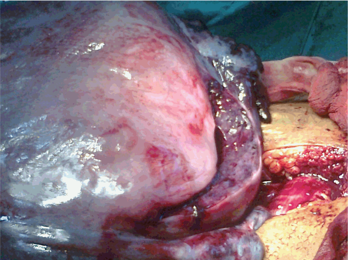 A 25-year-old female, residing in a rural area was admitted in emergency of a tertiary care hospital with decreased fetal movements and bleeding per vaginum since one day following amenorrhea of six months. She had fresh bleeding and had soaked six pads. The bleeding was accompanied by mild pain in abdomen, continuous, dull aching with no radiation. She was not booked as an ante-natal case at any hospital and this was her first hospital visit in this pregnancy. In her obstetric history, she had a full term vaginal delivery of a female stillborn baby, cause of which was not known. Rest of her past history, medical, surgical and personal was not significant. On general examination, she was conscious and oriented to time, place and person with severe pallor, feeble and hypovolumic pulse of 120/ minute, blood pressure 100/70 mmHg and temperature of 38°C. Systemic examination revealed tachypnea and crepitations in lung bases. On abdominal examination, there was abdominal wall edema, fundal height of 30–32 weeks (which was more than the period of gestation). As the uterine tone was increased, exact fetal lie and presentation could not be assessed. Fetal heart sound was absent. Internal examination revealed unripe closed cervix. A diagnosis of gravida two para one, 25 weeks 1 day pregnancy with intrauterine fetal demise, abruption placentae, severe anemia and pulmonary edema was made. Abdominal ultrasound showed a singleton intrauterine pregnancy with fetal demise with an upper segment placenta. Her blood investigations revealed a normal coagulation profile with deranged kidney function (Blood Urea 102 mg/dL, Sodium creatinine 2.5 mg/dL) and severe anemia (7 g/dL). Urinary albumin was present in traces (dipstick method). After stabilizing her condition, she was taken up for an emergency cesarean section in view of abruption placentae with unfavorable cervix as vaginal delivery was not imminent. On opening the abdomen (by an infraumblical midline vertical incision), the uterus was seen completely rotated on its axis; by 180 degrees. The fallopian tubes and ovaries were lying anteriorly. (Figure 1) Uterus was extremely enlarged filling the whole abdomen till epigastrium. Uterus, tubes and ovaries were bluish in color. With all attempts at detorsion failing, uterus was opened by a lower segment posterior incision. Baby was macerated stillborn, weighing 800 g. Placenta was lying completely separated. It was removed with all membranes and cotyledons with approximately 700 cc of retroplacental blood clots. After delivering the baby and placenta, detorsion of the uterus was done. Active management of third stage of labor was done by administration of 10 units syntocinon (oxytocin, novartis) intramuscularly. Despite this the uterus did not contract, instead it was flabby, enlarged, bag like and couvelaire. Aggressive administration of other uterotonics was done but the uterus remained flabby. Bilateral uterine arteries were ligated and B-Lynch sutures were applied subsequently. As the uterus did not respond to these, decision for subtotal hysterectomy was taken. Intra-abdominal drain was put after performing subtotal hysterectomy. Abdomen was closed in layers after confirming hemostasis. Peroperatively, the patient's hemodyanamic condition deteriorated. Vasopressor support and packed red blood units were given. Postoperatively, the vasopressor support was continued and as the patient stabilized, it was gradually tapered by the second postoperative day. The patient was recovering satisfactorily but had an episode of sudden pain in chest followed by breathlessness on third postoperative day. A probable diagnosis of pulmonary embolism was made. Unfortunately, the patient died before the diagnosis could be confirmed. |