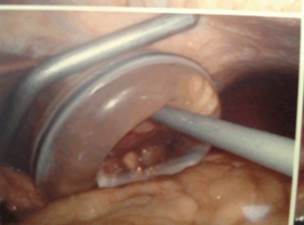 A 43-year-old male was presented to our upper gastrointestinal clinic with acute symptoms of reflux and dysphagia to both solids and liquids. He had undergone open anti-reflux surgery 15 years prior with the fitting of a now obsolete device-the Angelchik device. Until this episode, he had enjoyed a normal diet with well controlled gastroesophageal reflux disease (GERD) symptoms. He was listed for surgery due to the sudden onset of severe symptoms and inability to tolerate food. No erosion or injury to the esophagus was noted. However, it was evident that the prosthesis had moved into an abnormal position causing an acquired stenosis of the lumen. (Figure 1) It was removed in its entirety and an immediate laparoscopic Nissen's fundoplication was performed. The patient made an uneventful recovery from the procedure and was back to eating a normal diet within two weeks of the procedure. | ||||||