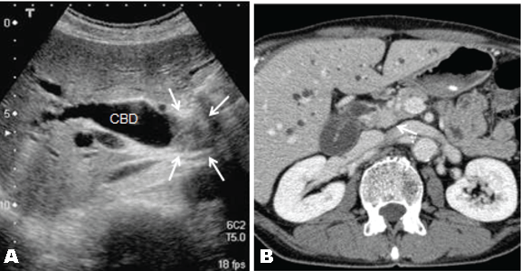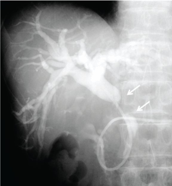 A 67-year-old male patient was referred to our hospital to investigate a case of jaundice on October 2010. He denied anorexia, abdominal pain, alcohol abuse and cigarette smoking. Physical examination revealed a mildly cachectic and icteric male with no acute distress. An abdominal examination revealed no palpable abdominal masses, organomegaly or evidence of ascites. He denied abdominal tenderness. On admission his total bilirubin level 7.52 mg/dL, alkaline phosphatase 1032 IU/L (normal range 105–320 IU/L), carcinoembryonic antigen 11.8 ng/dL (range, 0.0–5.0 ng/dL), carbohydrate antigen 19–9 was 765.1 Um/L (normal range 0.0-37.0 U/mL). Ultrasonography and contrast-enhanced computed tomography (CT) of the abdomen revealed a mass, approximately 2 cm in diameter, in the middle of the common bile duct (CBD), which caused the dilatation of the proximal biliary tract. (Figure 1A–B) Endoscopic retrograde naso-biliary drainage was successfully performed to improve the jaundice. Cholangiography and magnetic resonance cholangiopancreatography revealed a 2.5-cm filling defect in the middle of the CBD. (Figure 2) Based on these findings, the patient was diagnosed with middle bile duct cancer and a subtotal-stomach-preserving PD was planned. A 3D-CT angiography was performed prior to the PD procedure in order to identify the anatomy of the hepatic blood supply. The 3D-CT arteriography showed a normal trifurcation of the celiac trunk, CHA, left gastric artery and splenic artery. (Figure 3A) However, fused images from the 3D-CT arteriography and venography showed an unusual trajectory of the CHA, passing behind the portal vein, immediately running towards the ventral side between portal vein and CBD, and ascending to the hepatic hilum in front of the portal vein after giving off the gastroduodenal artery (Figure 3B). During surgery, we easily identified and safely dealt with the variant CHA and completed the complicated procedure including the skeletonization of this artery for lymph node dissection without any vascular injury. Pathological findings showed moderately differentiated tubular adenocarcinoma, T2, N1, M0, Stage IIB in terms of the UICC TNM classification. The patient had an uneventful postoperative course except for a grade B pancreatic fistula which was treated by percutaneous abdominal puncture. The patient was discharged on postoperative day-24 and remained disease-free for 16 months. | ||||||