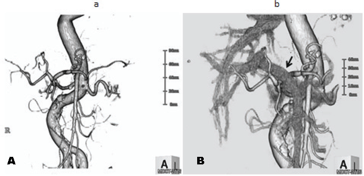 Pancreaticoduodenectomy (PD) requires complex surgical procedures associated with high morbidity and even the risk of mortality. [1] [2] [3] [4] [5] [6] [7] [8] [9] Variant arterial anatomy in patients undergoing PD increases the risk of injury of the hepatic blood supply which may result in biliary fistula or hepatic ischemia after surgery.[1] [7] [8] [9] Meanwhile anatomical variations of the hepatic artery are not uncommon, which can be observed in 25–45% of the cases. [5] [6] [7] [8] [9] Therefore, it is extremely important to identify these anomalous vessels prior to surgery when planning therapeutic strategies for PD. Visceral angiography or three-dimensional computed tomography (CT) arteriography (the arterial phase of 3D-CT angiography) is usually performed as a routine diagnostic procedure. However, it is difficult to identify the course variations with these examinations. We encountered a patient with a variant common hepatic artery (CHA) originating from the normal celiac trunk and passing behind the portal vein suffering from middle bile duct cancer. According to two large-scale retrospective studies concerning the variations of the hepatic blood supply, this course variation of the CHA is very rare, approximately 0.1% of the cases. [10] [11] We identified this rare variation by fusing images from 3D- CT arteriography and venography (the venous phase of 3D-CT angiography) before performing PD and therefore were able to safely deal with this variant CHA at surgery. | ||||||