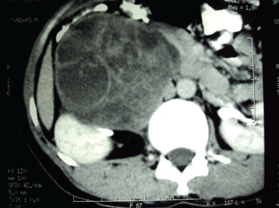 Schwannomas (neurilemmoma) are nerve sheath tumors that usually affect the head, neck and the flexor surfaces of the extremities. It is rare to find a schwannoma in the retroperitoneal cavity [3] [4] accounts for 0.3–3.2% of schwannomas. [7] They usually affect adult patients aged 20–50 years and females are more frequently affected than males. [1] [2] Schwannomas have true capsules composed of epineurium. [5] The tumor mass is characteristically eccentric with respect to the affected nerve. Retroperitoneal schwannomas show cystic degeneration in up to 60% of cases while calcification is seen in 23% of cases only. These changes make diagnosis even more difficult. Although target and fascicular signs are characteristic radiological features of schwannoma, these are not frequently seen in retroperitoneal schwannomas. In the absence of typical signs, diagnosing a retroperitoneal schwannoma is difficult when using cross-sectional imaging alone. Computed tomography and ultrasonography should be used to guide tissue biopsies and identify the aggressive features of a malignant schwannoma, which account for about 1% of retroperitoneal schwannomas. Schwannomas are encapsulated tumors. [5] Microscopically, they demonstrate Antoni A areas (densely cellular, arranged in short bundles or interlacing fascicles) and Antoni B areas (fewer cells, organized, with great myxoid component). They are positive for S-100 [6] and negative for CD-34. Detecting a malignant retroperitoneal schwannoma is crucial for effective management as these carry a much poorer prognosis. Its clinical, radiological, and histological features usually clinch the diagnosis. Radiologically, a malignant schwannoma has irregular margins and infiltrates the adjacent structures. Distant metastases via perineural and intra-neural routes are characteristic features. Histologically, an infiltrative margin with nuclear palisading is a striking feature. In terms of treatment, surgery is the modality of choice for retroperitoneal schwannomas. Chemotherapy and radiotherapy have only limited roles. In malignant schwannomas, adjuvant chemotherapy or radiotherapy has marginal added benefit; some authors advocate induction chemotherapy for this condition. Our patient had benign neurilemmoma with already cystic degeneration which could not be removed fully due to severe hemorrhage and close proximity to duodenum and inferior vena cava. Postoperatively patient was closely followed-up for a period of eight months which revealed no recurrence of disease which might have been due to degeneration that had already set in. | ||||||