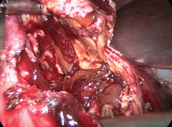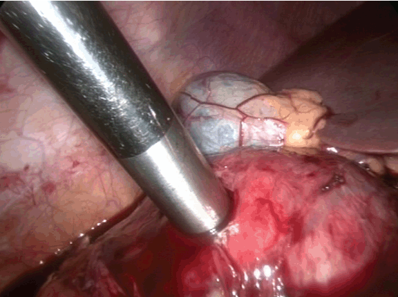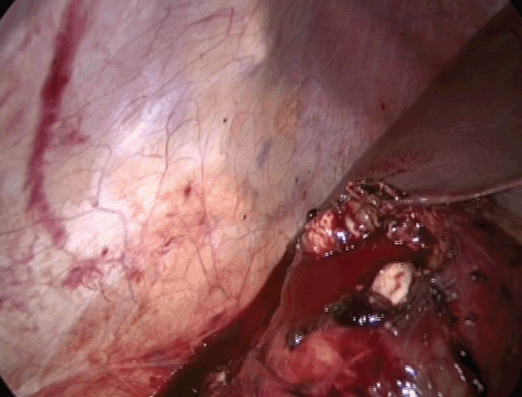 A 30-year-old female presented with pain on right side of abdomen since a month. Clinical examination revealed a firm mass of 8x10 cm in the right hypochondrium and lumbar region. Routine hemogram was normal and liver function test was normal. Ultrasound revealed well defined heterogeneous lesion with multiple membrane, solid cystic portion with internal echoes, of size 12.4x7 cm in sub hepatic space probably hydatid cyst. Computed tomography (CT) scan revealed a large well defined circumscribed oval complex cystic mass lesion in right hypochondrium and lumbar region abutting right lobe of liver and right kidney. (Figure 1) On the operation table laparoscopy showed cystic mass. (Figure 2) With preoperative diagnosis of hydatid cyst, aspiration revealed straw colour fluid at the beginning with cheesy material with hydatid cannula. (Figure 3) Deroofing of the cyst was done. (Figure 4) Later frank blood started coming which could not be controlled, (Figure 5) so abdomen was opened by right sub costal incision. Whole of the cyst cannot be removed since its close proximity to inferior vena cava and duodenum, however, most of the cyst wall was removed. Hemostasis achieved by placing a ribbon pack which was removed three days postoperatively. Postoperative period was uneventful. A week later histopathological examination came out as benign neurilemmoma. No recurrence of the cyst or no symptoms were noted after following-up patient for a period of eight months. | ||||||