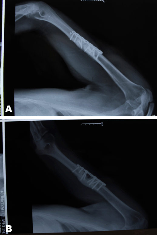 Most of the humeral fractures heal uneventfully with conservative methods. Although the operative treatment of fractures has improved the care of many patients, it may also produce undesirable consequences. Loss of fixation and non-union are two major complications of humeral fractures treated with open reduction and plate fixation. Non-union rates of humeral shaft fractures are reported 10–15% with surgical treatment methods. [1] [2] Open fractures, segmental fractures, highly comminuted fractures, transvers fractures and impaired host healing (diabetes, smoking and malnutrition) are the basic risk factors of humerus shaft non-union. If a humeral shaft non-union is diagnosed, conservative treatment methods are not recommended because of poor results reported. [3] If previous surgery has been performed hardware removal, debriding the fibrous tissue, bone grafting and fixation should be done to achieve a solid union. External fixation should be necessary in cases of infected non-unions where internal devices are not useful for fixation. Loss of fixation is the result of inadequate surgical technique. To achieve stability with plate osteosynthesis, the plate must have adequate thickness and length. By compression plating at least four screws holes must overlie each major distal end proximal fragments and equal length of plate and number of screws should be on both sides of fracture. [4] Obvious loss of stability on radiographs or clinical examination is a clear evidence of non-union and should be re-evaluated for revision surgery. We would like to present a case where a humeral shaft fracture treated with inadequate plating technique resulted with loss of fixation and treated with close manipulation and bracing without hardware removal. | ||||||