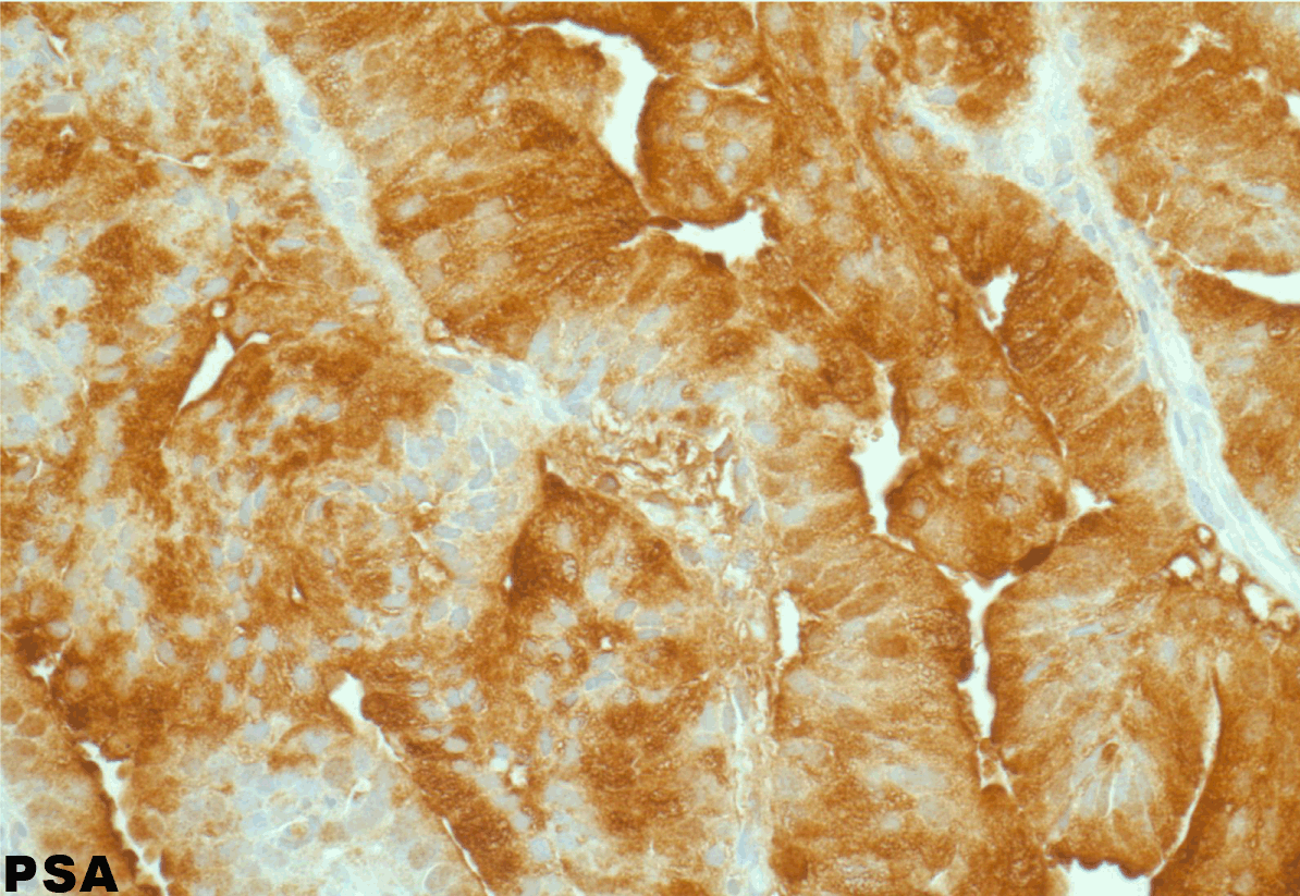 A 56-year-old male was presented with complaints of hemospermia. His PSA was below 0.1, urinalysis was negative, and digital rectal examination was normal. He was, therefore, reassured and given a course of antibiotics. One month later, his symptoms had not resolved despite a course of antibiotics. Flexible cystoscopy was, therefore, performed and revealed no evidence of bladder malignancy but noted an inflammatory-looking polyp extending off the right portion of the verumontanum. A transurethral resection of the abnormality revealed histological features consistent with ductal adenocarcinoma. (Figure 1) (Figure 2) Specifically, tall, pseudostratified, columnar cells with abundant cytoplasm arranged in a predominantly papillary pattern were seen on H&E stain, (Figure 1) with PSA immunohistochemistry staining verifying the prostatic origin of the malignancy (Figure 2) and distinguishing it from colorectal cancer invading the prostate. Following an initial period of active surveillance elected by the patient, he eventually underwent a radical prostatectomy. Final pathological evaluation of the prostate specimen indicated a focus of Gleason score 7 (4+3) ductal adenocarcinoma with two foci of acinar adenocarcinoma of Gleason score 8 (4+4). Surgical margins were negative. The patient had an uneventful postoperative recovery and remained disease-free on follow-up visits. | ||||||