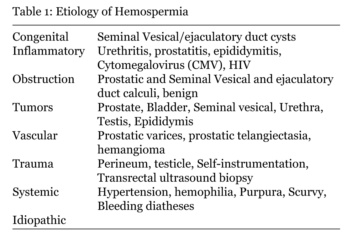 Hemospermia is a symptom largely considered to be benign but in elderly patients with co-existing urological symptoms, the increased odds of prostate cancer detection should motivate thorough clinical evaluation for ductal prostatic adenocarcinoma. | ||||||