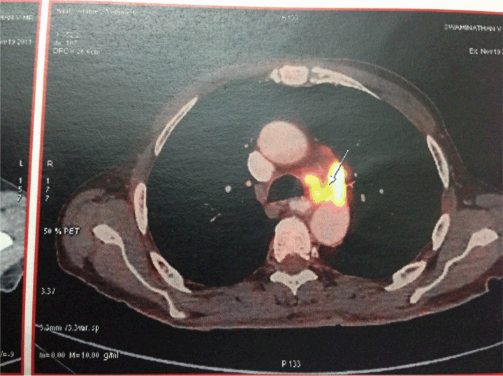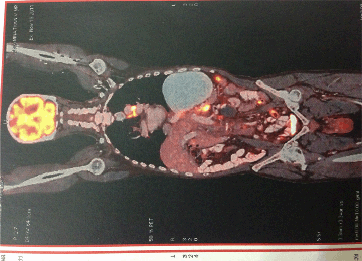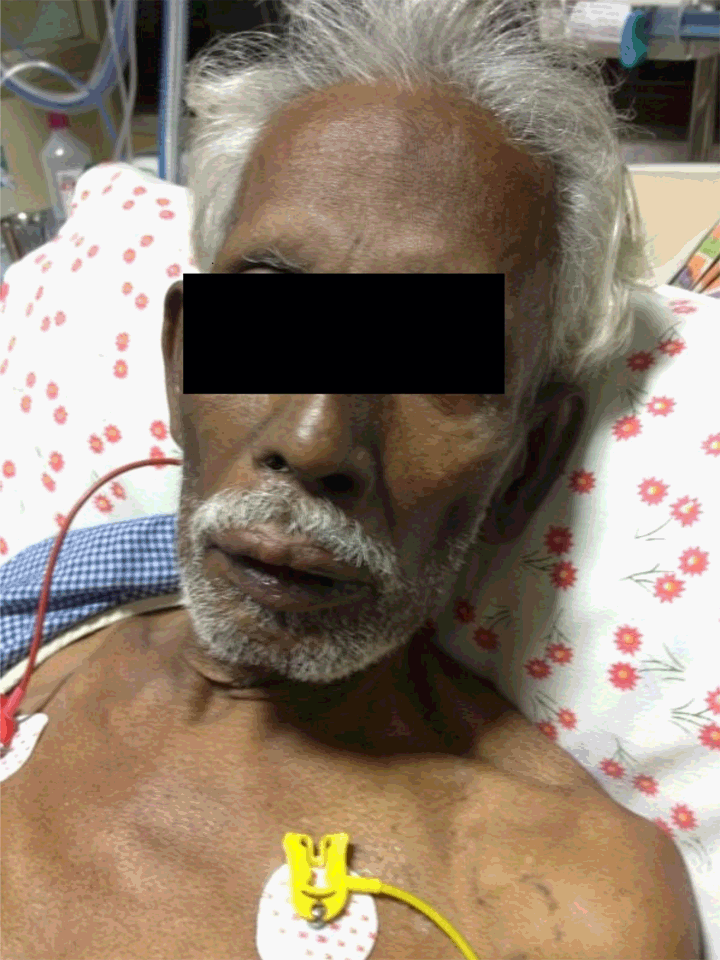 A 72-year old male, without any known comorbidities, was admitted to our hospital due to altered mental status, weakness, anorexia, hematemesis and urinary incontinence for three days. He complained of abdominal distension and dyspepsia for the last two years. There was a loss of appetite and weight of about 10 kg. At the time of admission to hospital, physical examination revealed blood pressure 110/80 mmHg, tachycardia 120 bpm with no other specific systemic finding. The patient was severely dehydrated, presented with decreased reflexes and his skin showed hyperpigmentation. (Figure 1) Laboratory tests demonstrated hyponatremia (serum sodium 125 mEq/L), hyperkalemia (serum potassium 5.6 mEq/L), anemia (Hb 7.3 g/dL) and mild metabolic acidosis (pH 7.25). The electrocardiogram showed normal QRS complexes. There was a mild rise in serum urea 47 mg/dL and normal serum creatinine levels 0.8 mg/dL. After ruling out tuberculosis and drug induced adrenalitis, computed tomography (CT) scan of chest and abdominal was done. Gastric carcinoma with perigastric, periceliac and para aortic lymphadenopathy along with bilateral metastases of the adrenal glands was found. (Figure 2) We performed a whole body positron emission tomography (PET) scan which further validated the CT findings. (Figure 3) The biopsy showed a moderate to poorly differentiating adenocarcinoma in the gastric antrum. Based on the patient’s clinical status and the laboratory test results, in addition to the magnitude of the adrenal masses, we decided to perform a high dose cosyntropin stimulation test. The serum cortisol level was 420 nmol/L before the intramuscular administration of cosyntropin (250 µg), and 61,438 nmol/L 60 minutes after the administration. These results combined with the elevated levels of adrenocorticotropic hormones (ACTH) 165.7 pg/mL before the administration, and the diagnosis of adrenal insufficiency had been established. After fluid substitution, administration of glucose/insulin, calcium gluconate, sodium bicarbonate, salbutamol, furosemide, cation exchange resin, and initiation of replacement therapy with glucocorticoids and fludrocortisone, the patient improved within a few days. Sodium and pH levels normalized after two days. The patient returned to normal life activity under methylprednisolone administration and was able to undergo chemotherapy for his primary disease. | ||||||