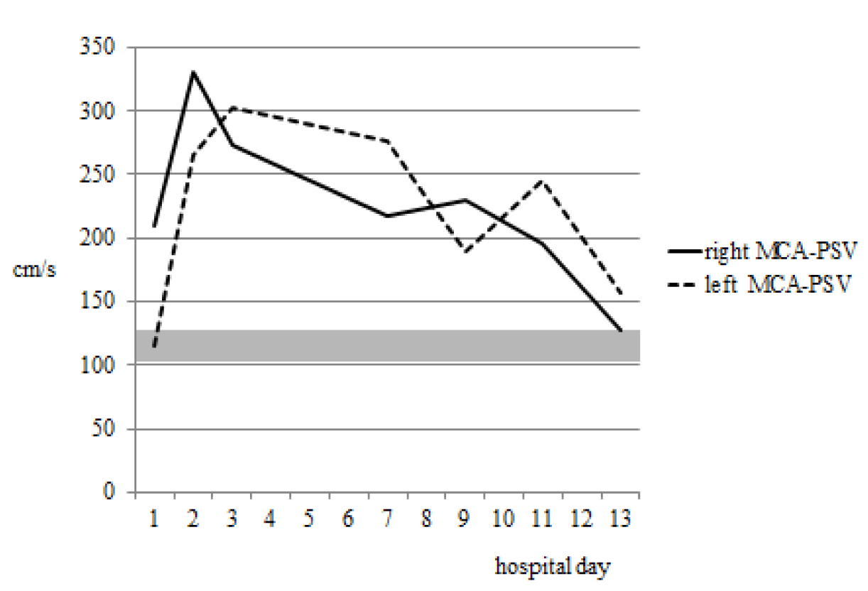 RCVS (Reversible Cerebral Vasoconstriction Syndrome), Pregnancy, TCCFI (Transcranial color flow imaging), peak systolic velocity