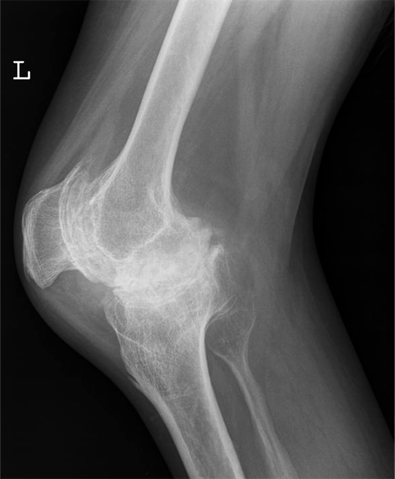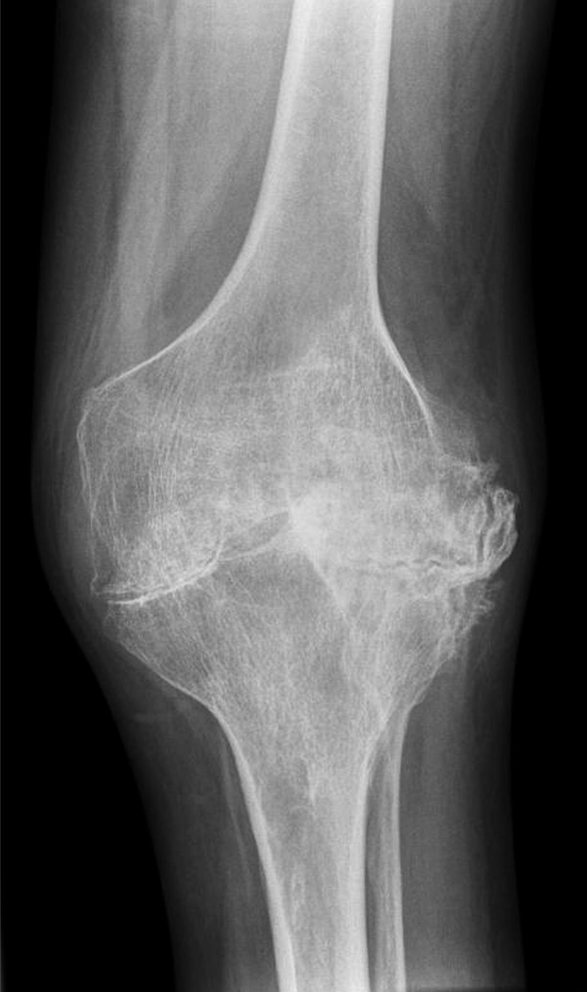 A 34-year-old male with hemophilia A presented to the emergency department with pain and swelling in his left knee following a minor fall. He was known to suffer from advanced arthropathy and was awaiting a total knee replacement. On clinical examination, the left knee was swollen and tender with a reduced range of movement. Plain radiograph (antero-posterior and lateral views) performed (Figure 1) (Figure 2)excluded a fracture or dislocation but demonstrated classic appearances of hemophilic arthropathy with severe secondary degenerative changes. He was discharged with adequate simple analgesia and outpatient follow-up appointments with his hematologist and physiotherapist. | ||||||